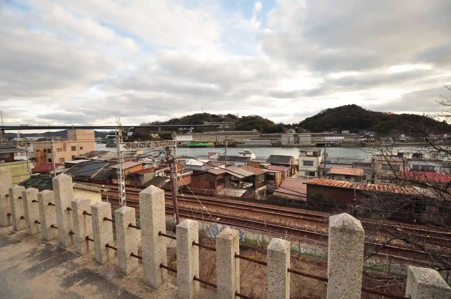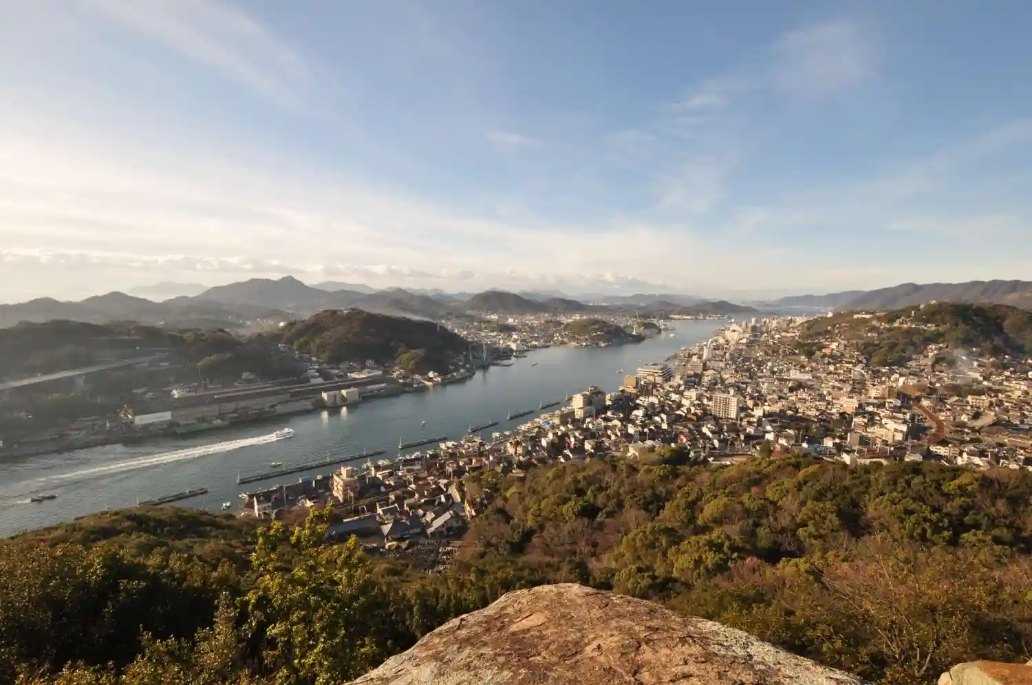 ~山門でうしろをふり返ると、眼下に広がっているのは海。大小さまざまな船が行きかう尾道水道である。寺の山門から見える景色としては、ちょっとめずらしいものだろう。さらに対岸に目を向けると、造船所や鉄工所などが見える。~