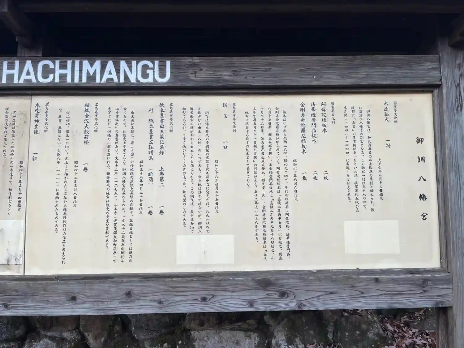 | 文化財 | 【重要文化財】狛犬1対、木造行道面13面(附:木造菩薩面3面)、木造僧形八幡神坐像2躯、木造僧形神坐像1躯、木造女神坐像3躯、木造天部形立像1躯、阿弥陀経板木2枚・法華経普門品板木2枚・金剛寿命陀羅尼経板木1枚