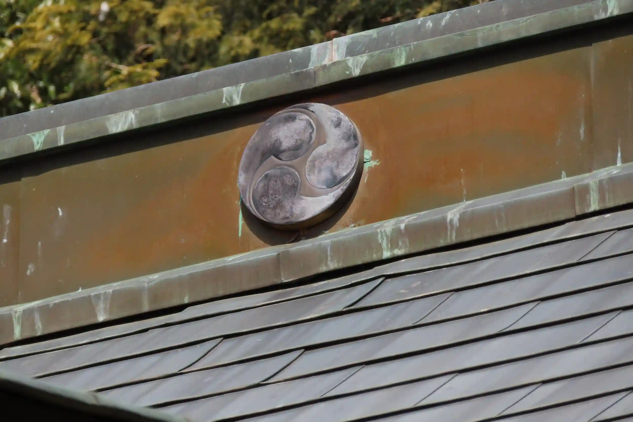 本殿の屋根は銅板葺、拝殿と神楽殿は赤の石州瓦の万十唐草。