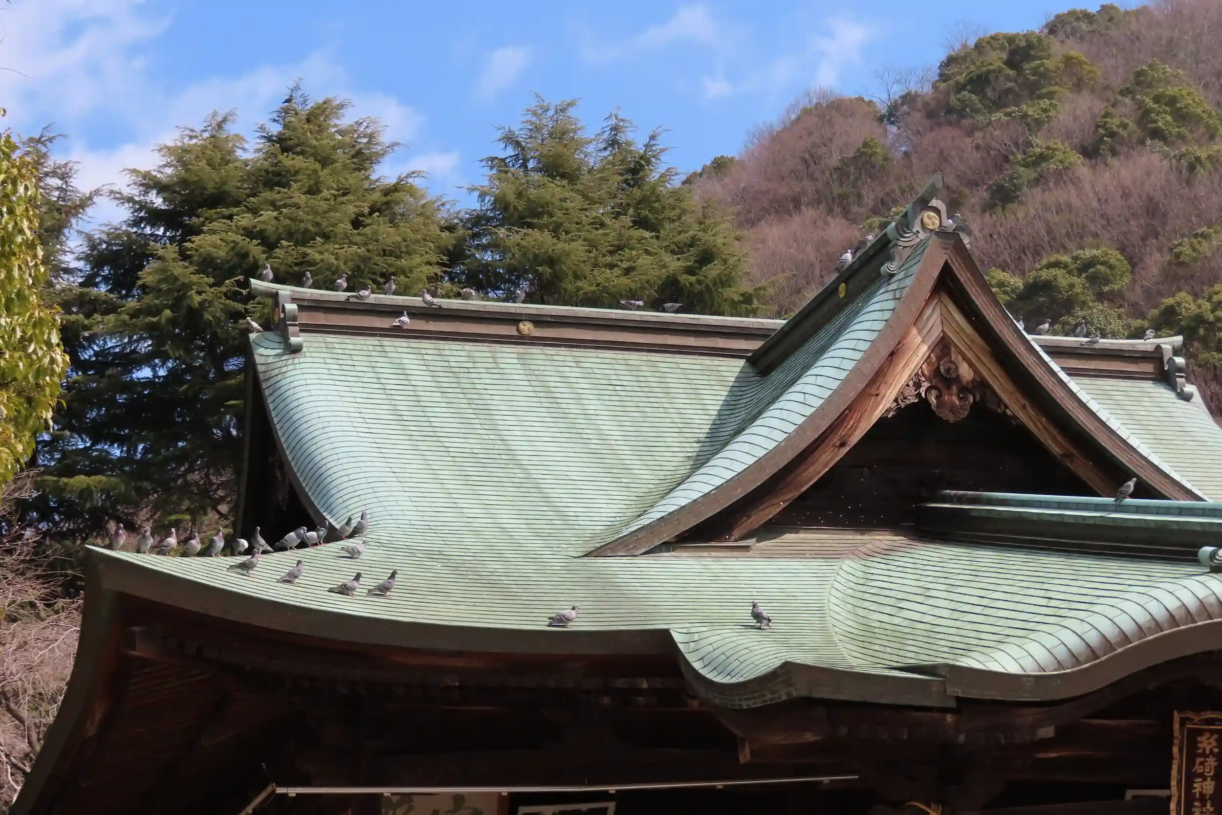 拝殿にたくさんの鳩が集まってきました。