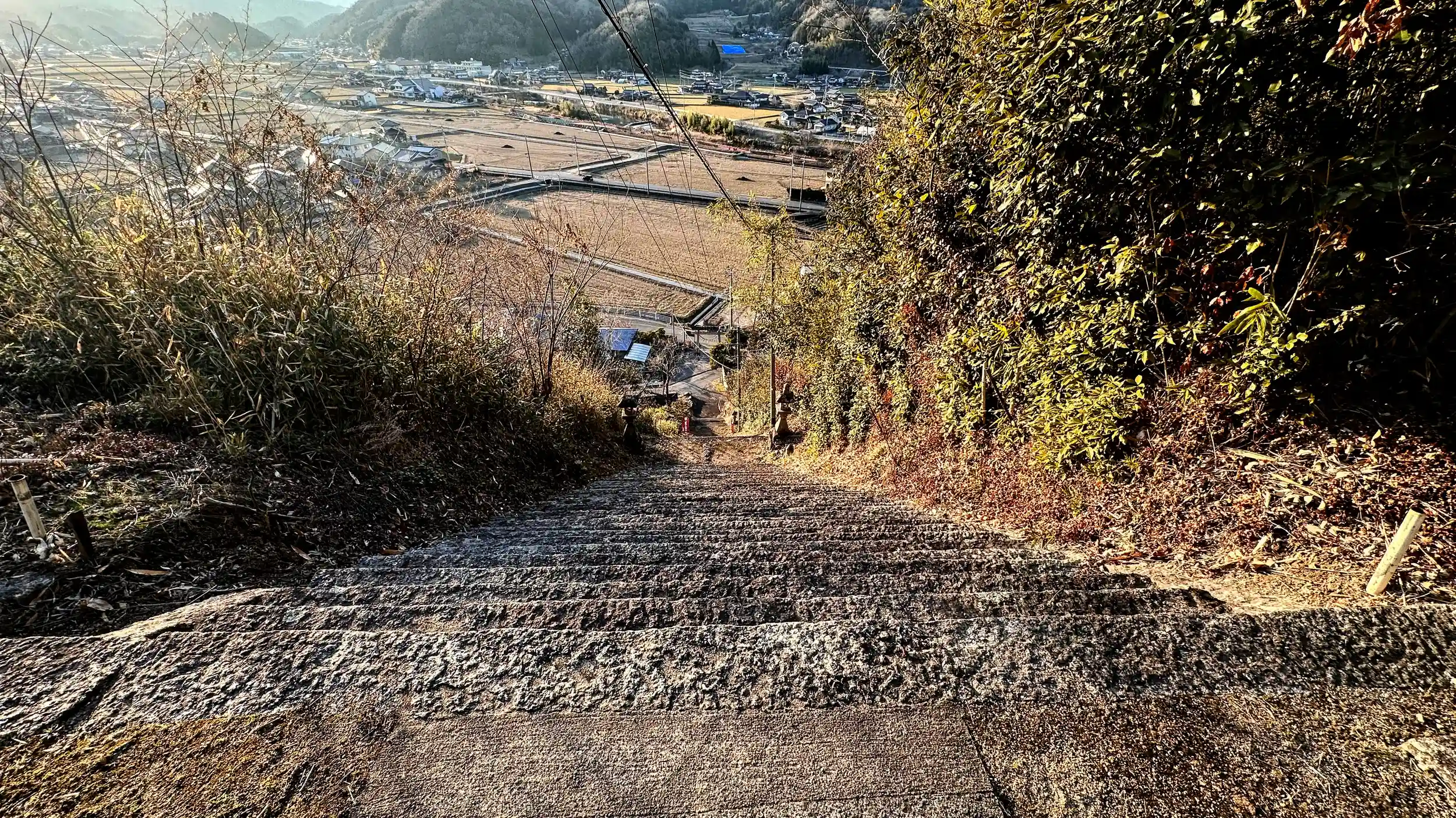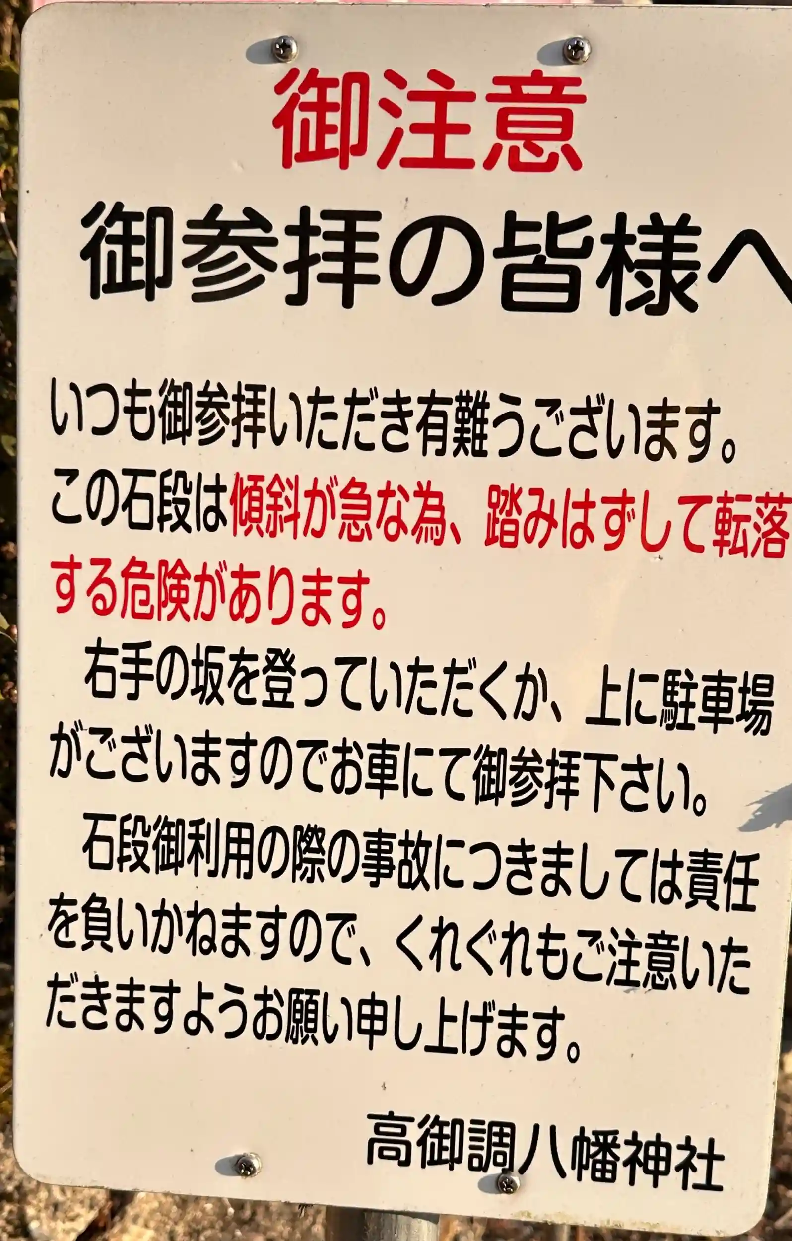 参道の階段がまるで梯子のようでしかも長く高台まで一気に駆け上がっています、石段は201段 階段下には注意書きがあります。このあたりの神社のほとんどは山の中腹以上にあり、過酷な参拝になります。当然境内からの見晴らしは最高です 社号票には「髙御調八幡神社」神楽殿、拝殿、本殿とも立派で素晴らしいです
