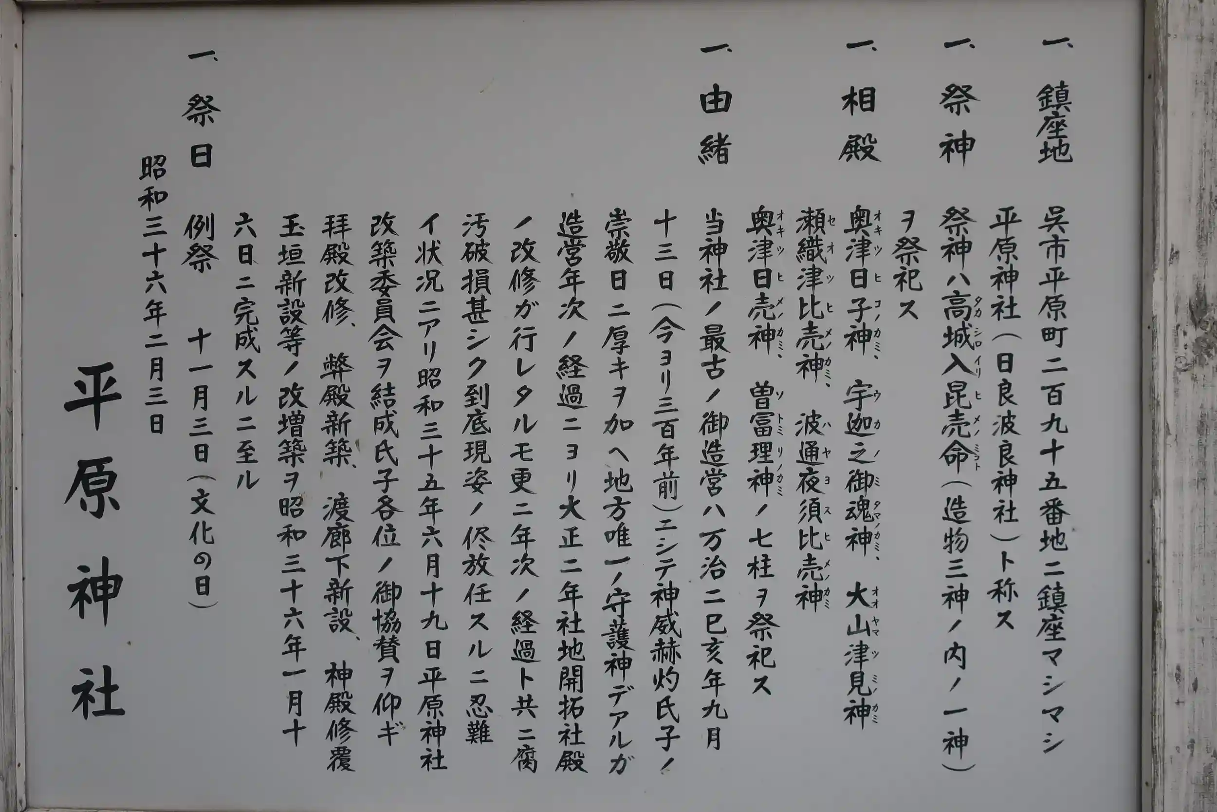 平原神社の御由緒書きには相殿神を合わせて七柱が記載されています。