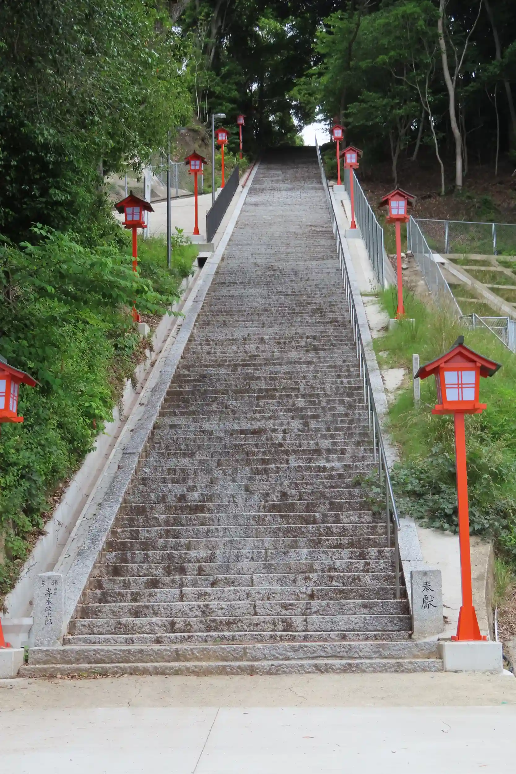 特徴のある木製の両部鳥居をくぐると真っすぐに階段が延びています。階段を