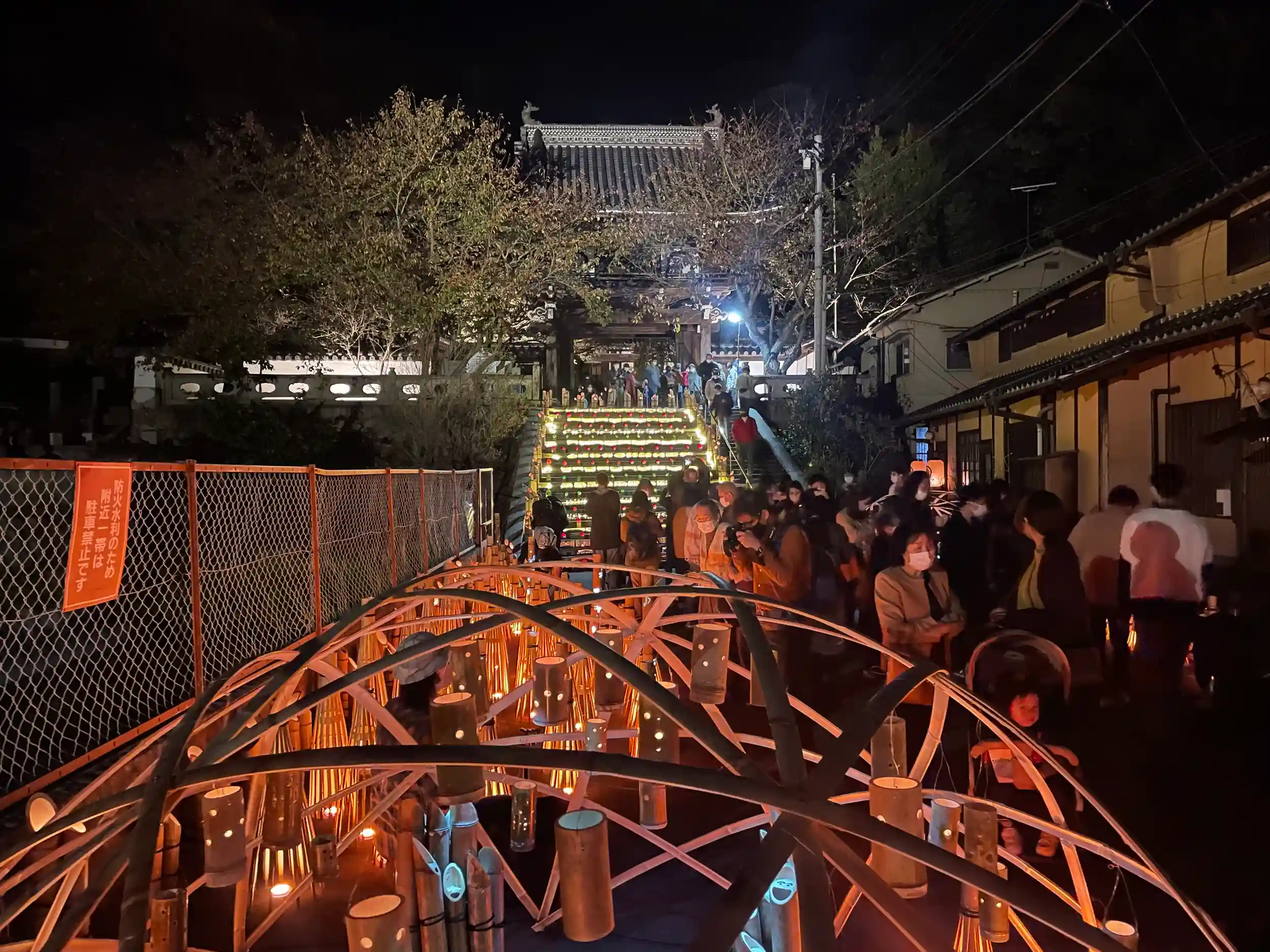 憧憬の道で境内にも竹明かりがあり 階段がとてもきれいにライトアップされていました。