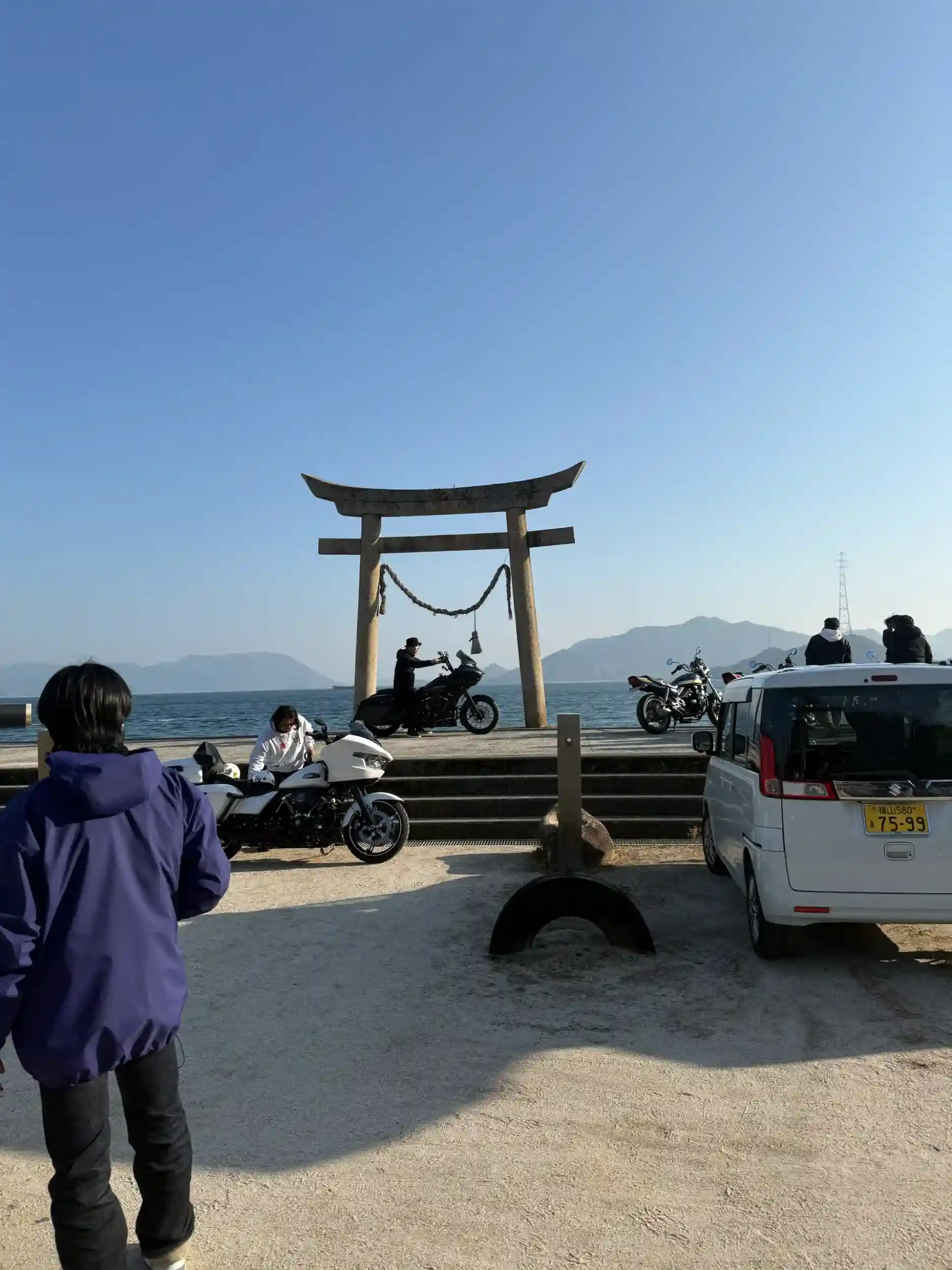 海に面して鳥居が立っている。