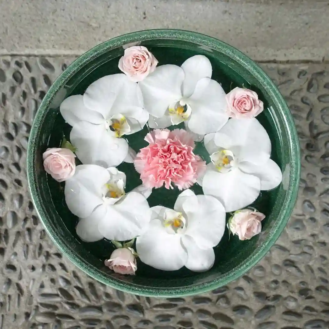 小さすぎず大きすぎず、花手水を活けるカンバスとしては程よい良い大きさで、先ず眼に映り込む迫力も、そして繊細な侘び寂びの世界も、お花そのものの大きさとバランス良くご覧になれます。