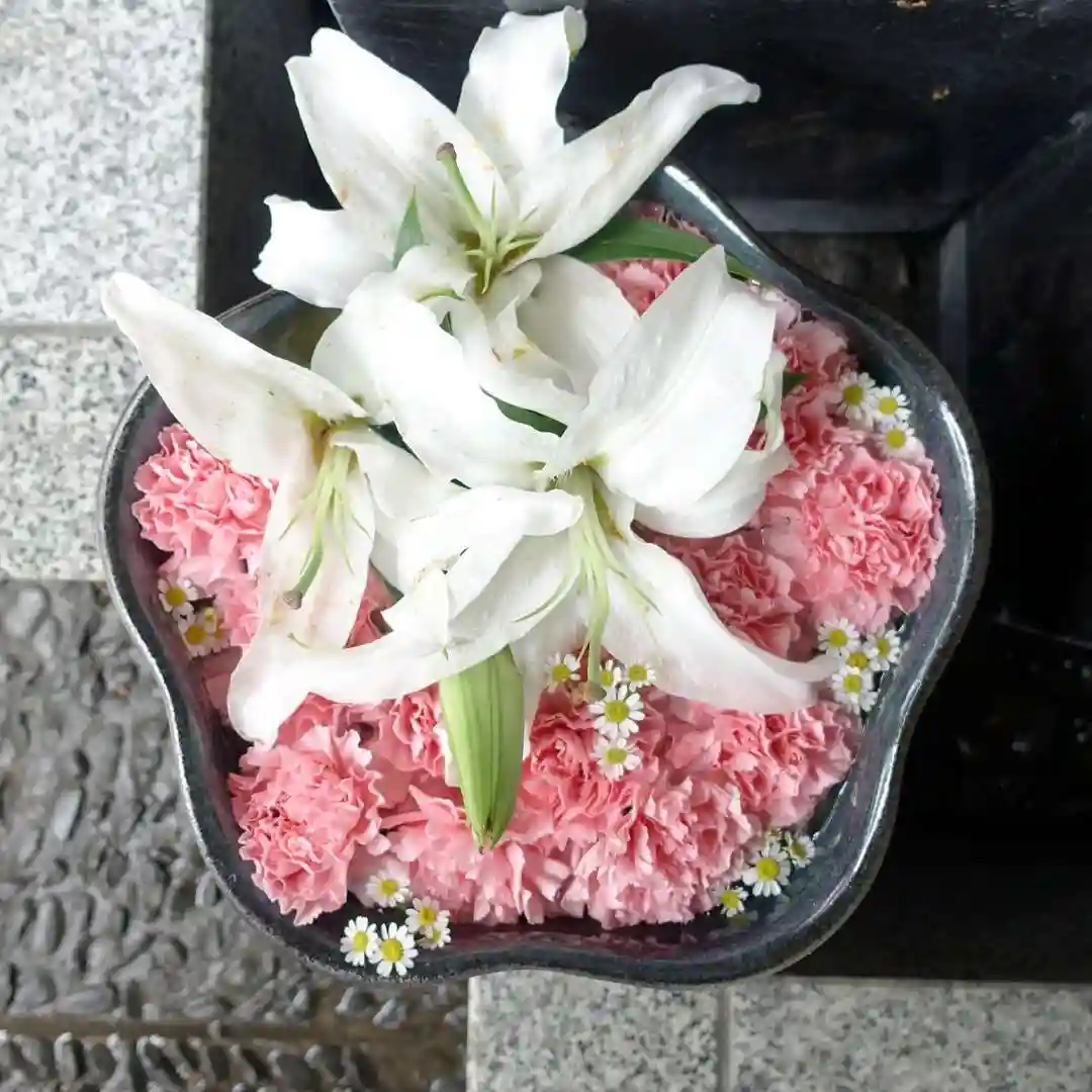 帯廣神社の花手水は、公開後まだ綺麗なお花は「水鉢」に移し替え、