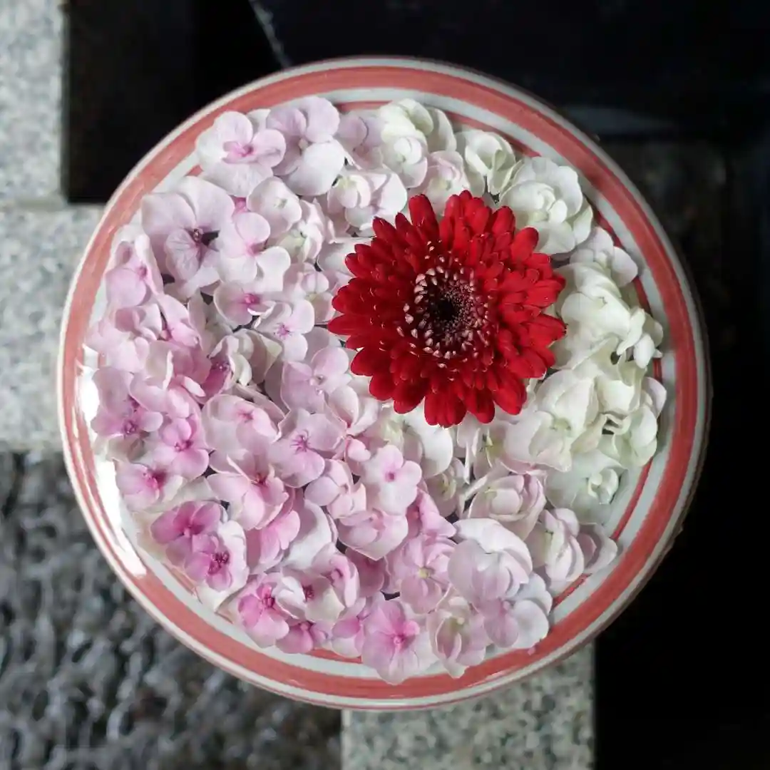帯廣神社の花手水は、公開後まだ綺麗なお花は「水鉢」に移し替え、