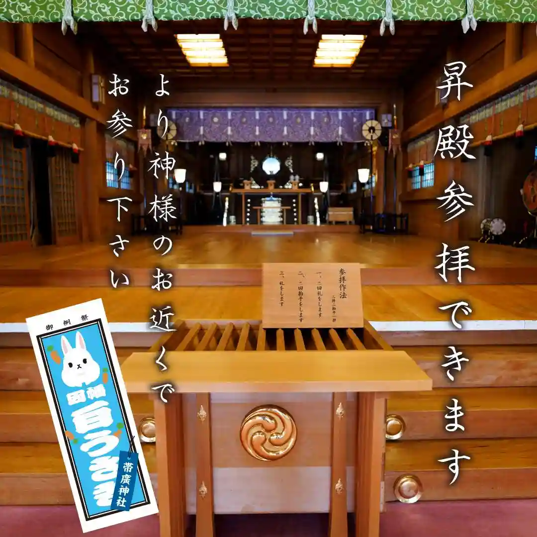 帯廣神社のご祭神の一柱「大那牟遅神 おおなむちのかみ」は、出雲大社のご祭神「大国主神 おおぬくにぬすのかみ」と同じ神様であり、日本神話の「いなばの白うさぎ」に登場します。