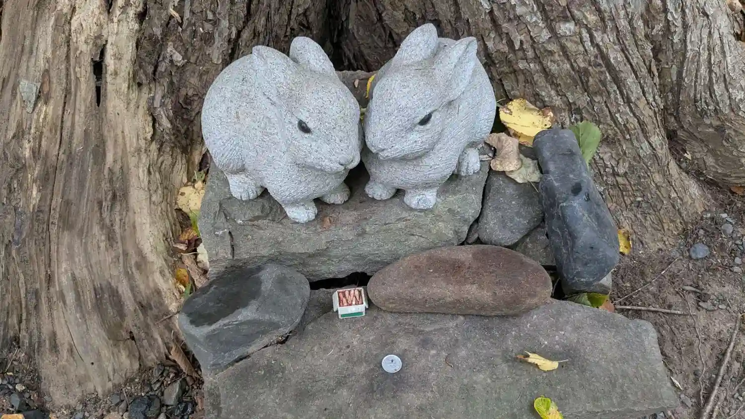 ウサギさんかな?岩の上にかわいい置物