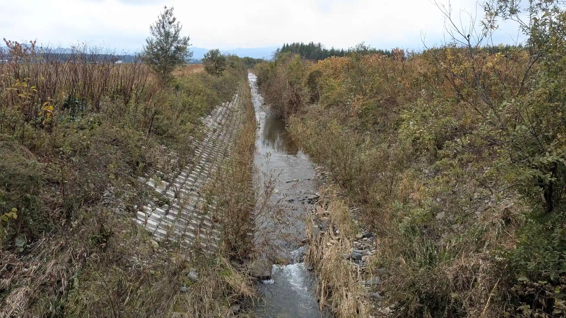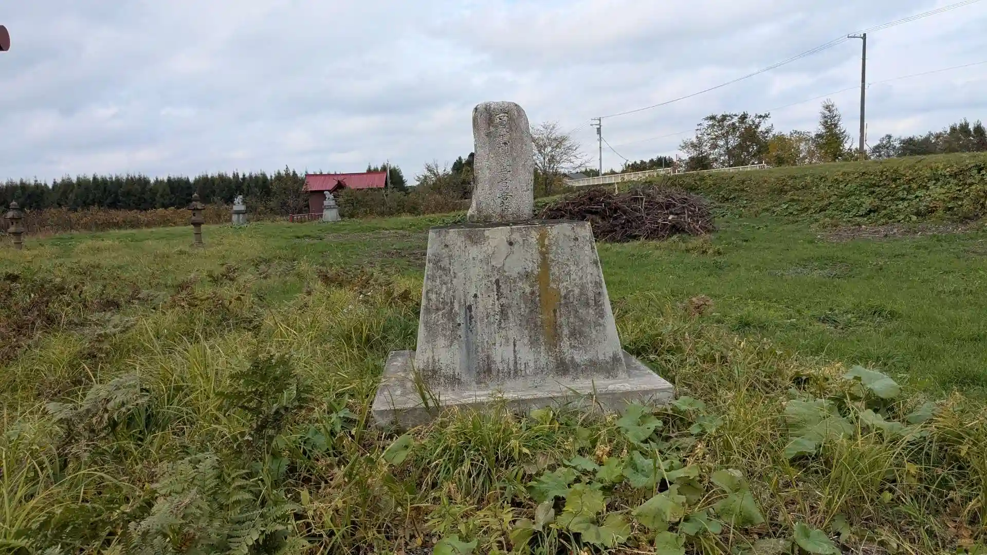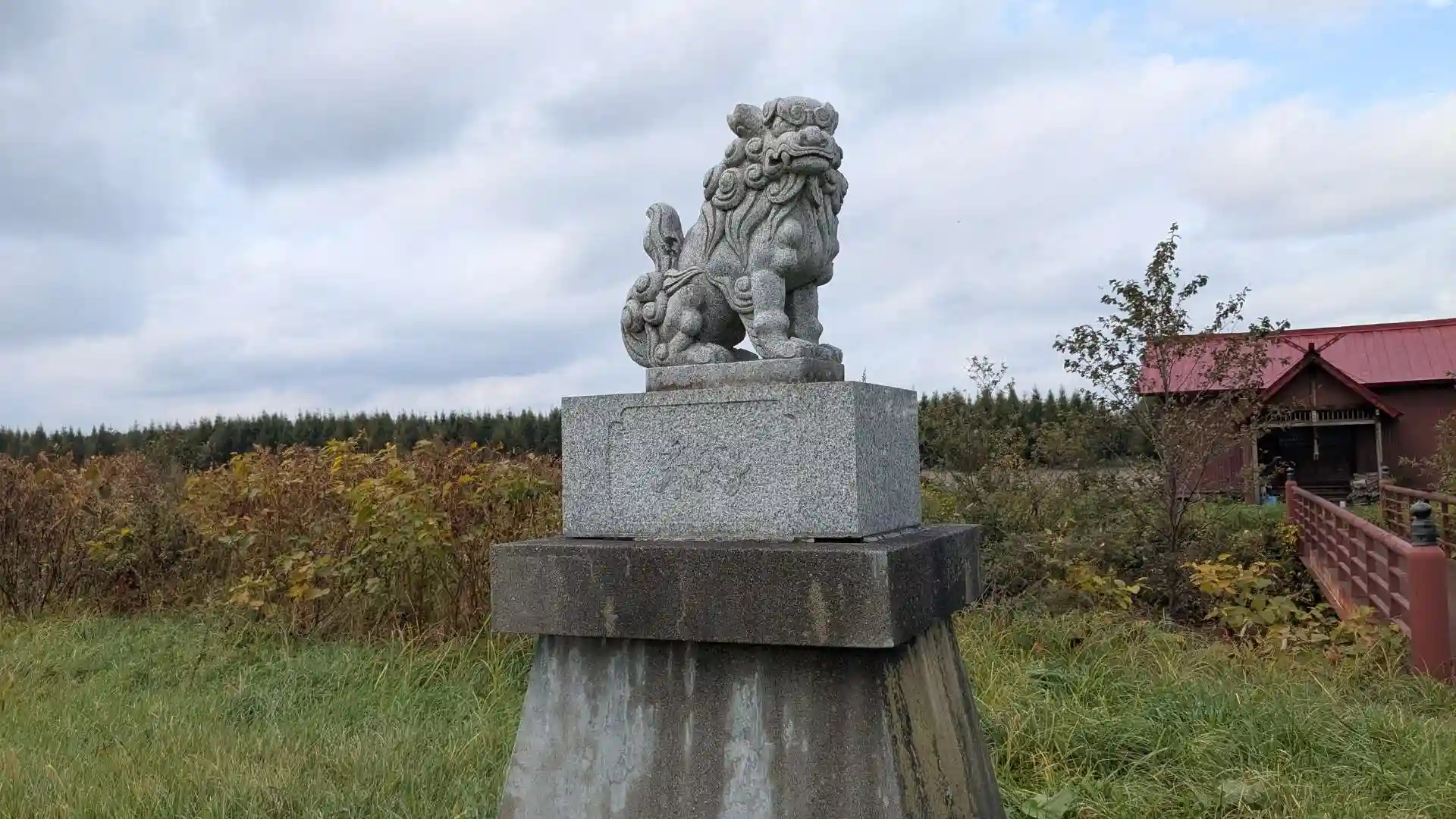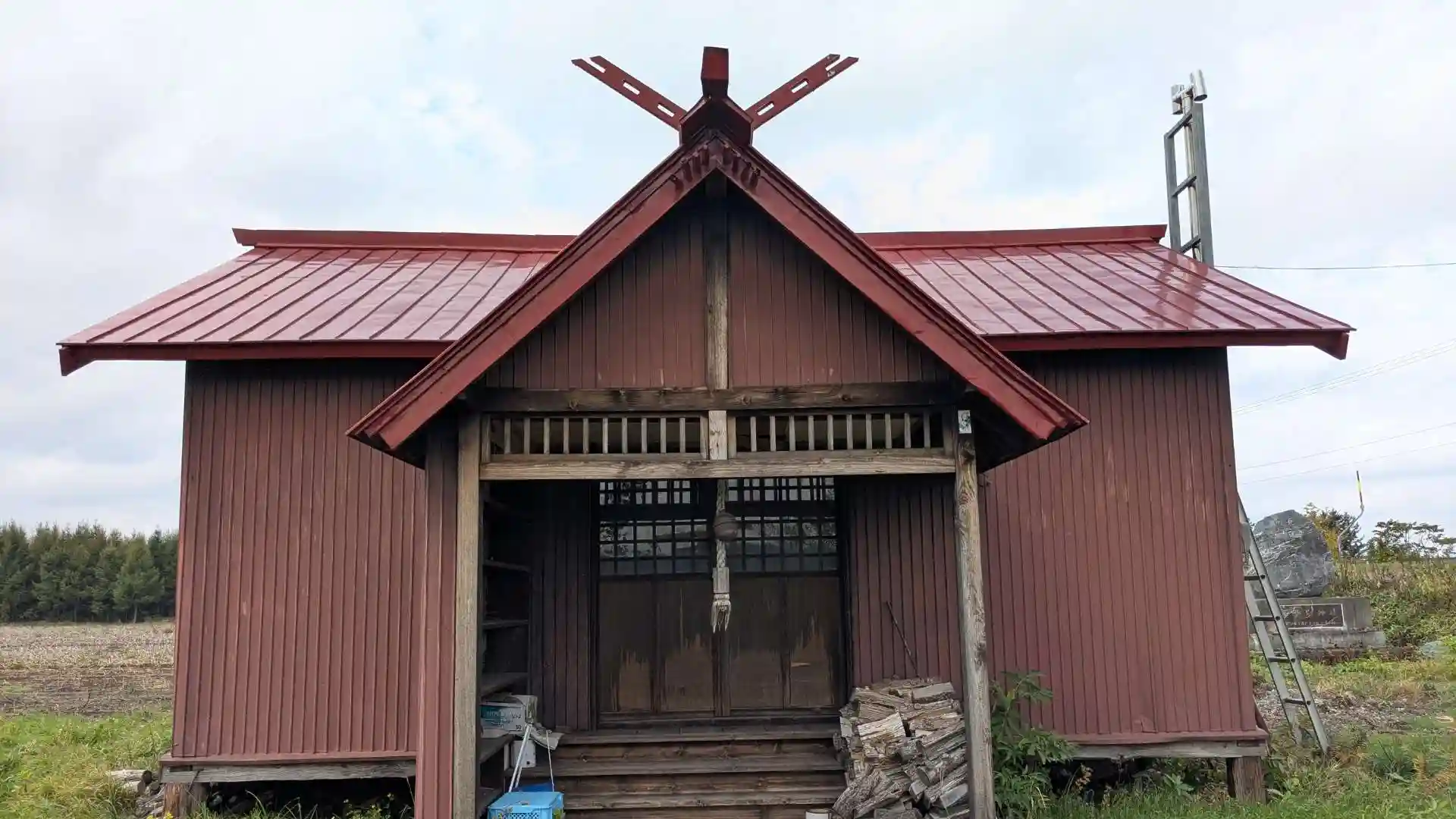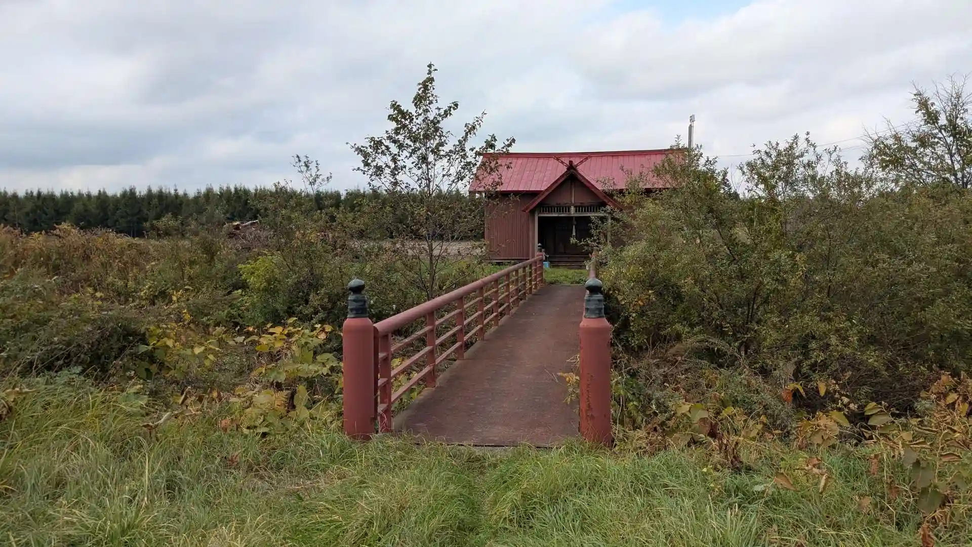 中札内村との境の近くにあります。鳥居から社殿までの参道は草が生え放題で向かうのが大変。紅い社殿前のサラベツ川に橋が掛かっています。