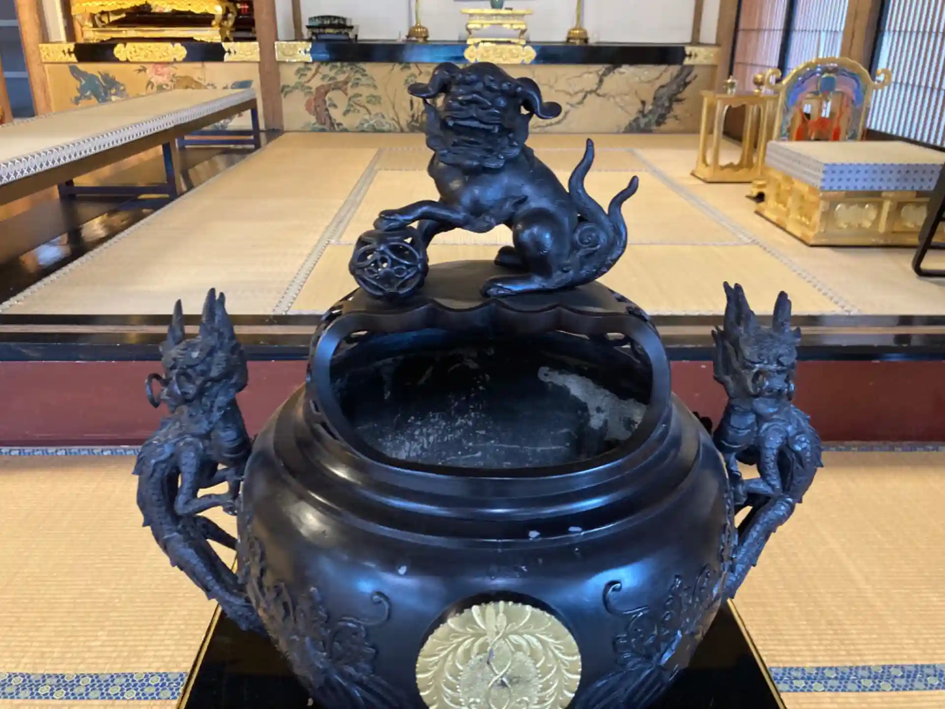 大きな香炉で、まりに足を乗せた獅子と両脇のとってが小龍になっています。