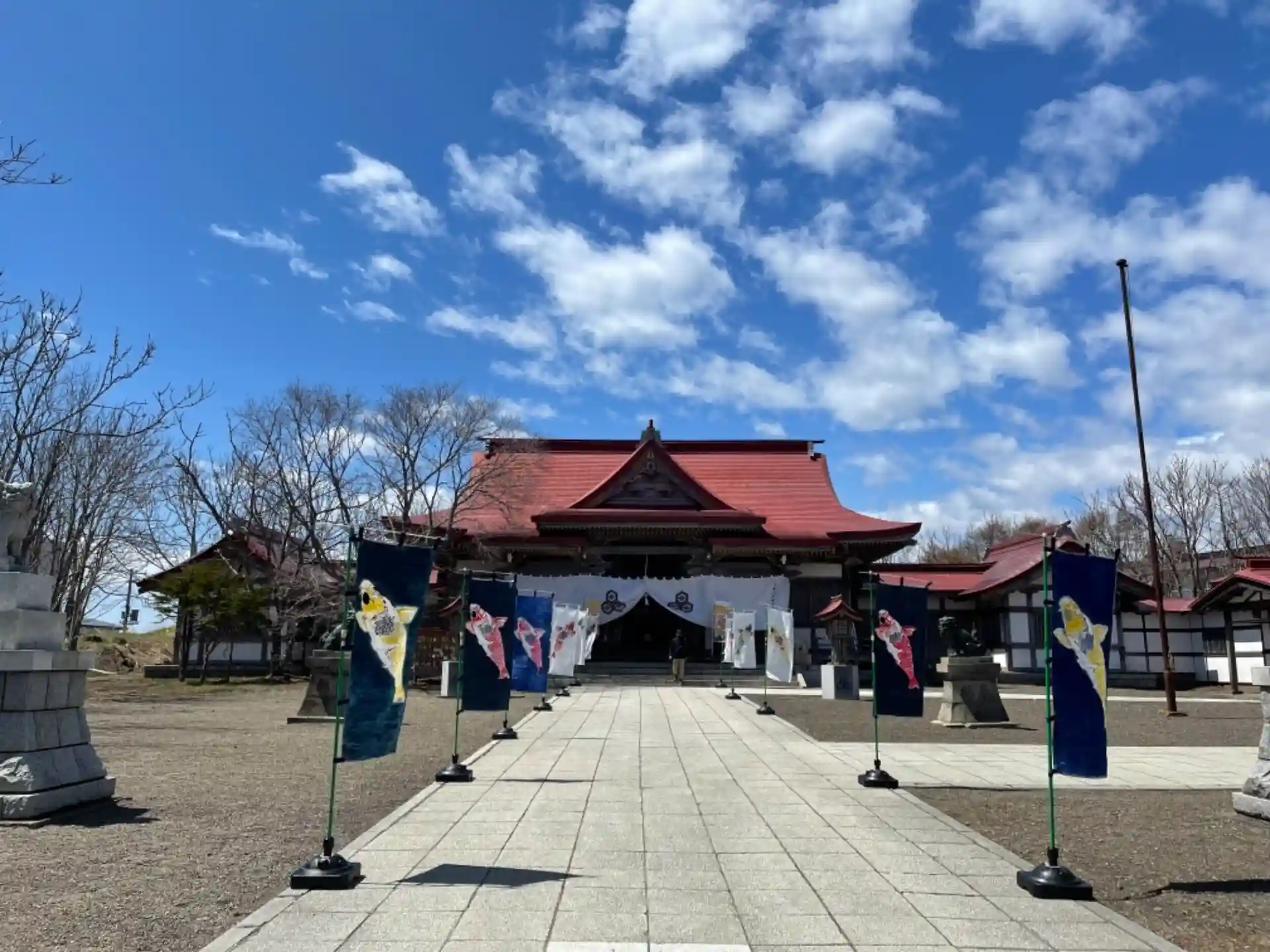 鯉のぼりの起源である「鯉の幟」を境内の参道に並べています。風に揺れると鯉が泳いでいるように見えますね。