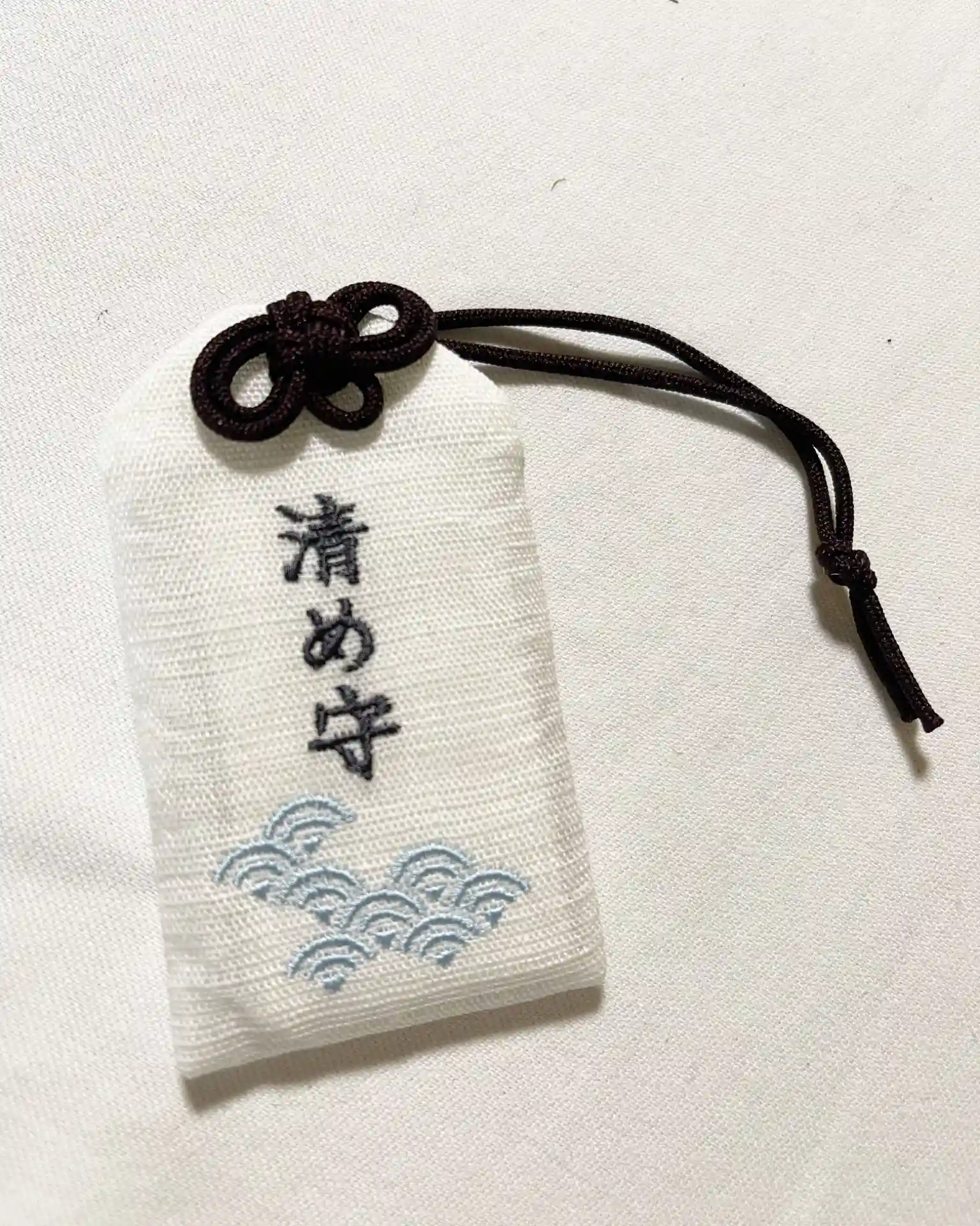 白の麻布に水色で青海波の刺繍が施された爽やかな当神社オリジナルの御守です。