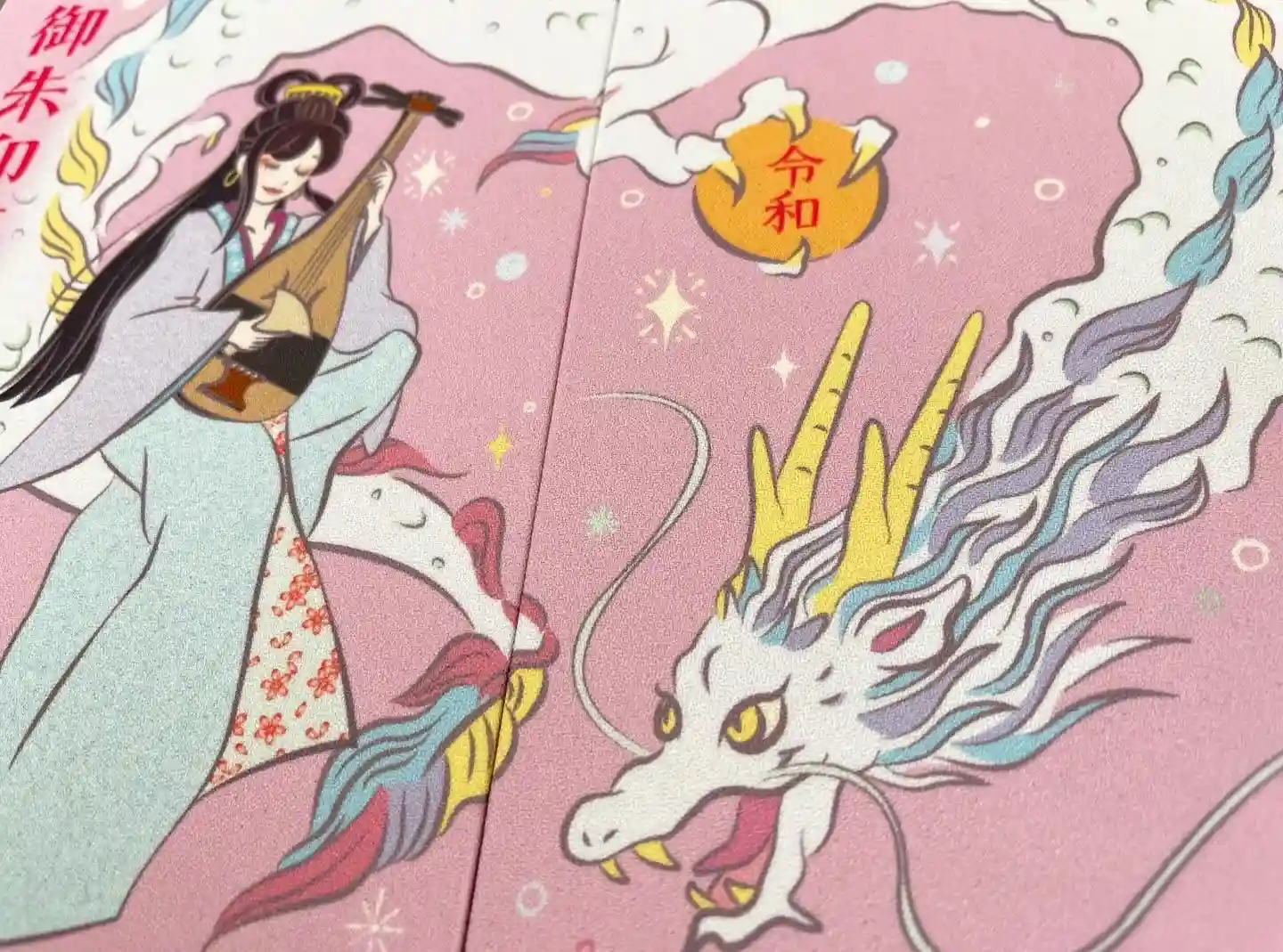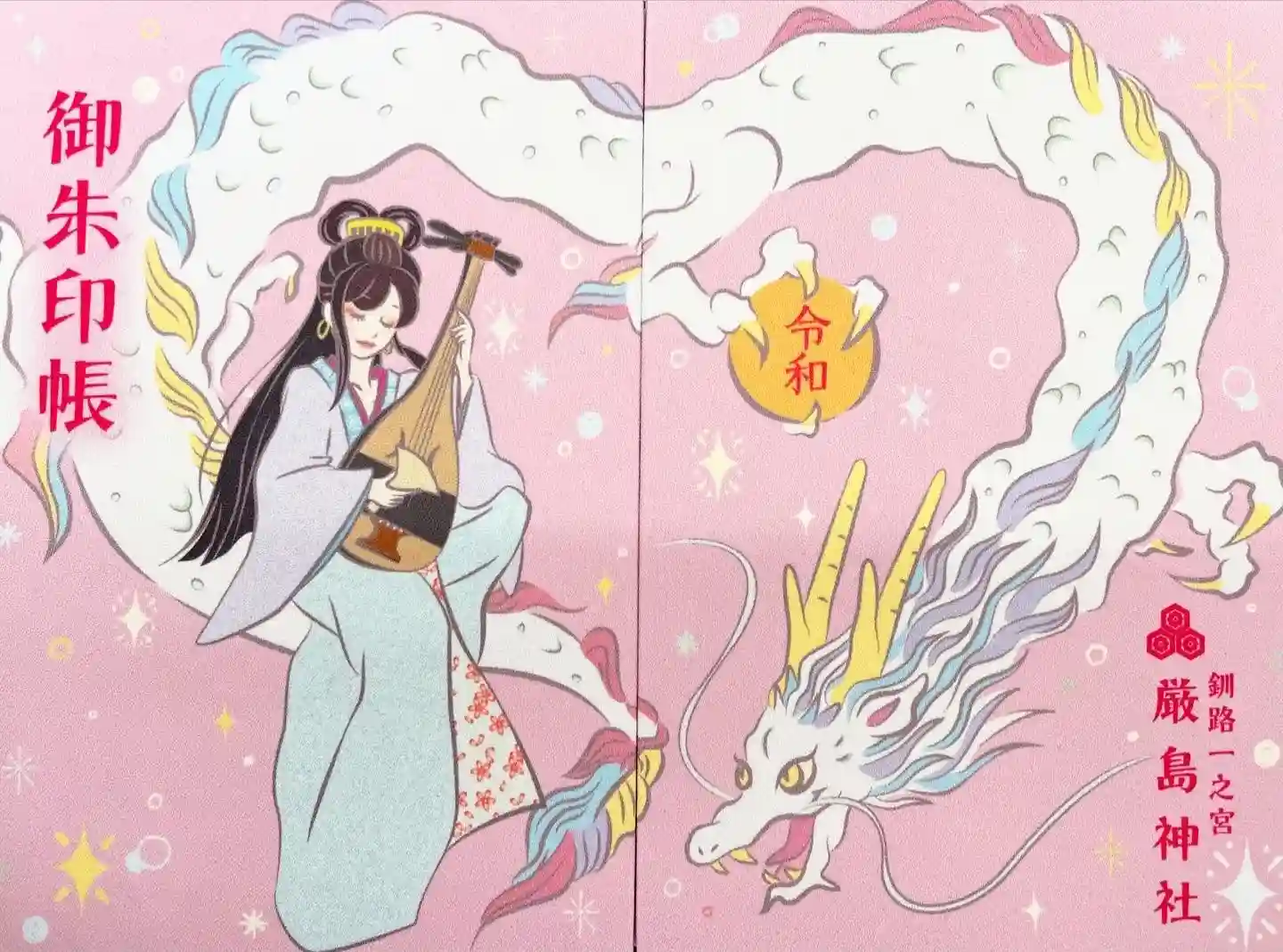 主祭神であられる市杵島姫命さまが白龍に乗り琵琶を奏でる絵柄となっております。