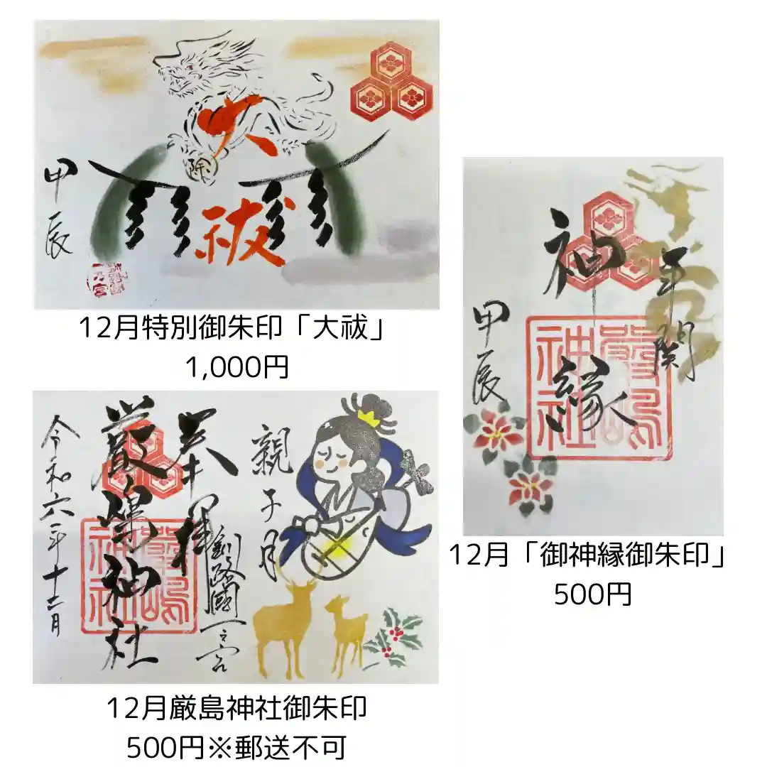 厳島神社以外の特別御朱印は郵送でもお分かちをしております。詳細はホームページお知らせ欄をご覧ください。