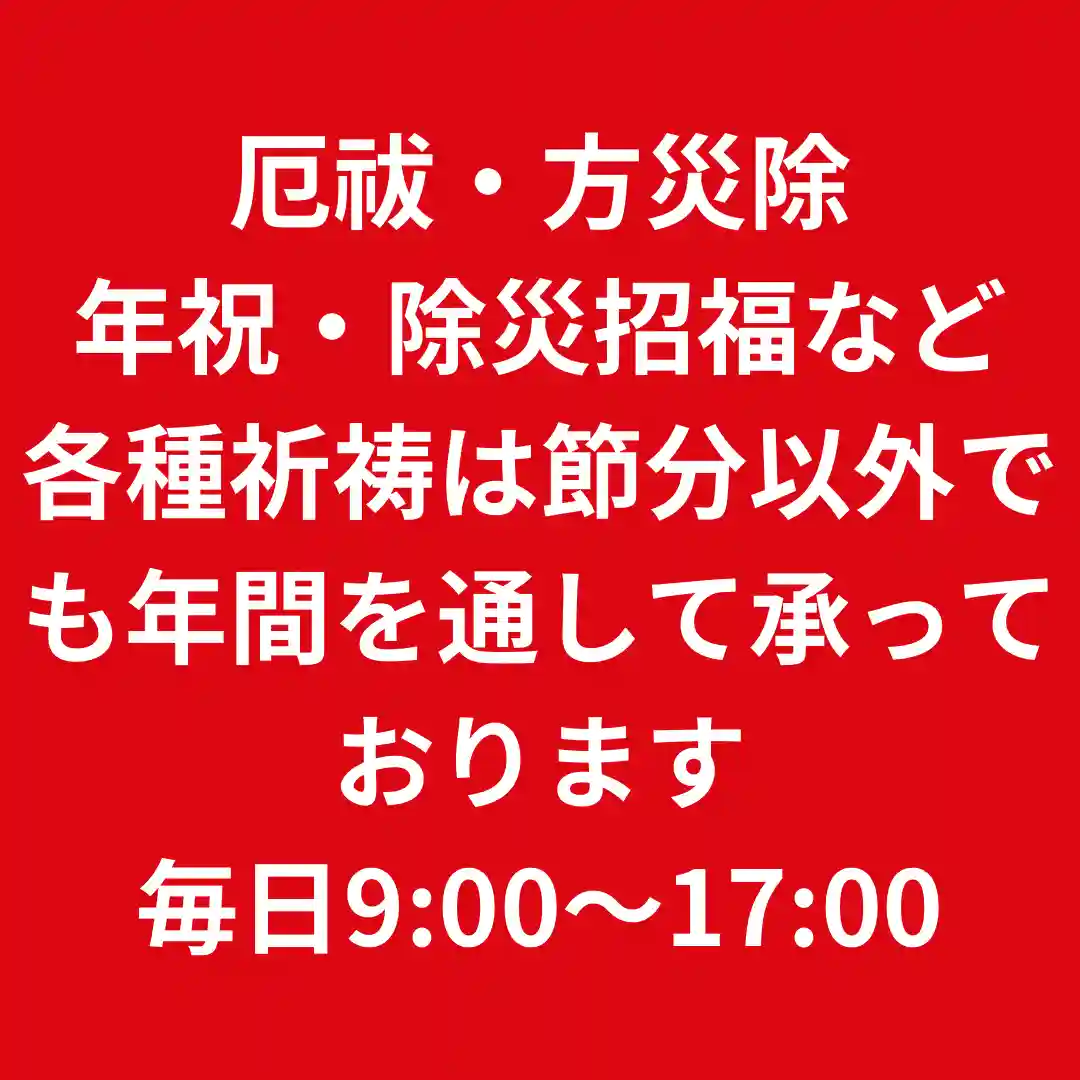 尚、厄祓い•方災除けのご祈願は毎日9:00〜17:00承っております。2/2以外のお日にち希望の場合はご予約の上お越しください。
