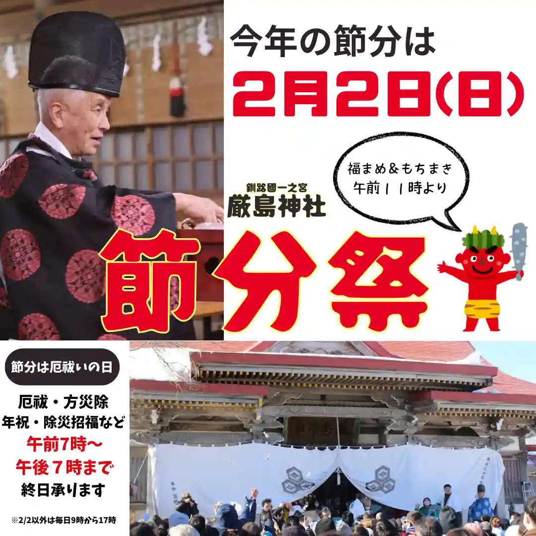 節分祭は旧暦でいう一年の初め「立春」の前日の節目にお祓いを行い、釧路市町民や氏子崇敬者の皆様が災厄なく一年をお過ごしいただけますよう氏神さまに祈願する由緒あるご祭事です。