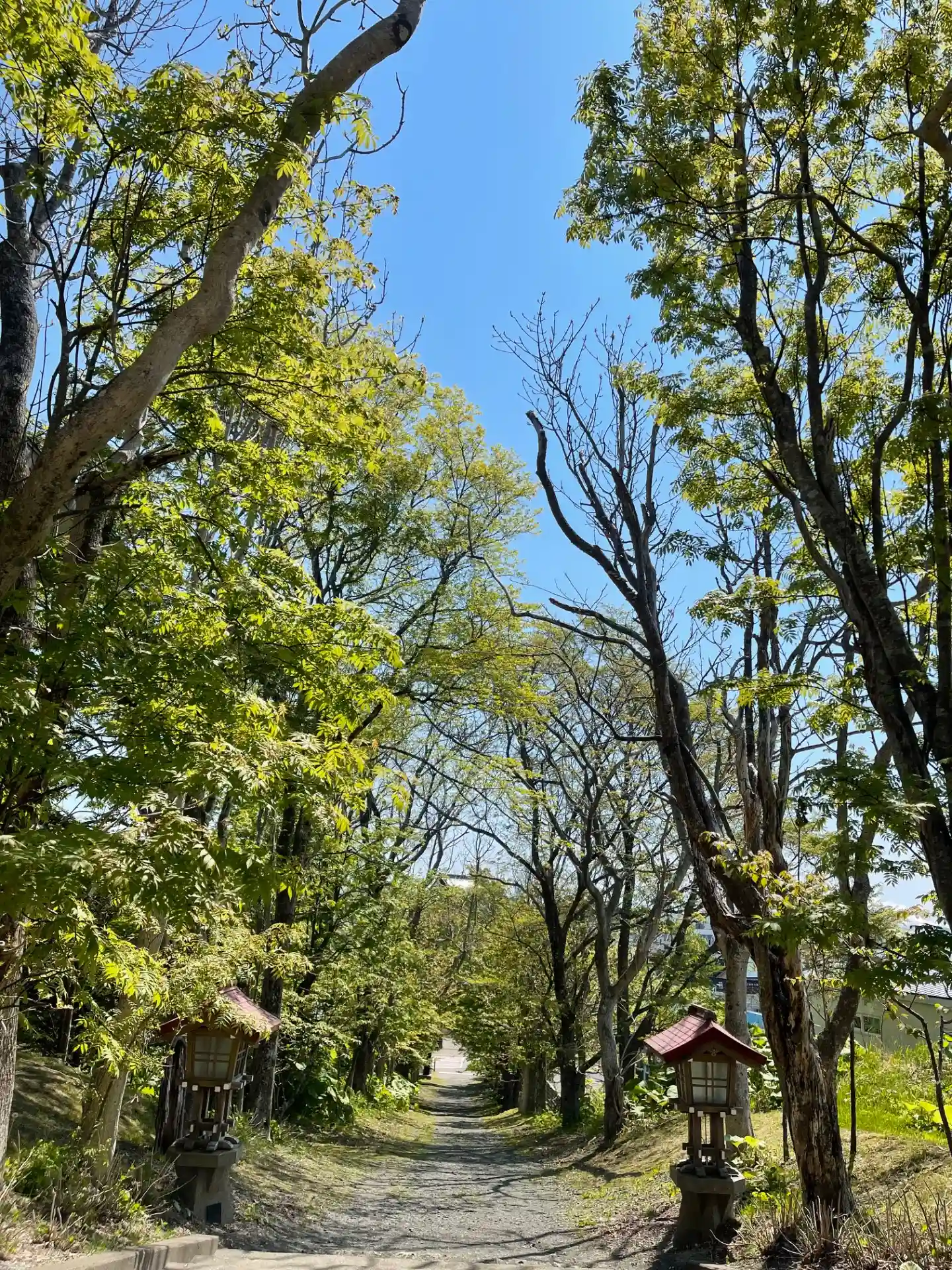 釧路はまだ初夏とはほど遠いですが、陽が差す日中はこの参道を通ると心地よい気分になります。