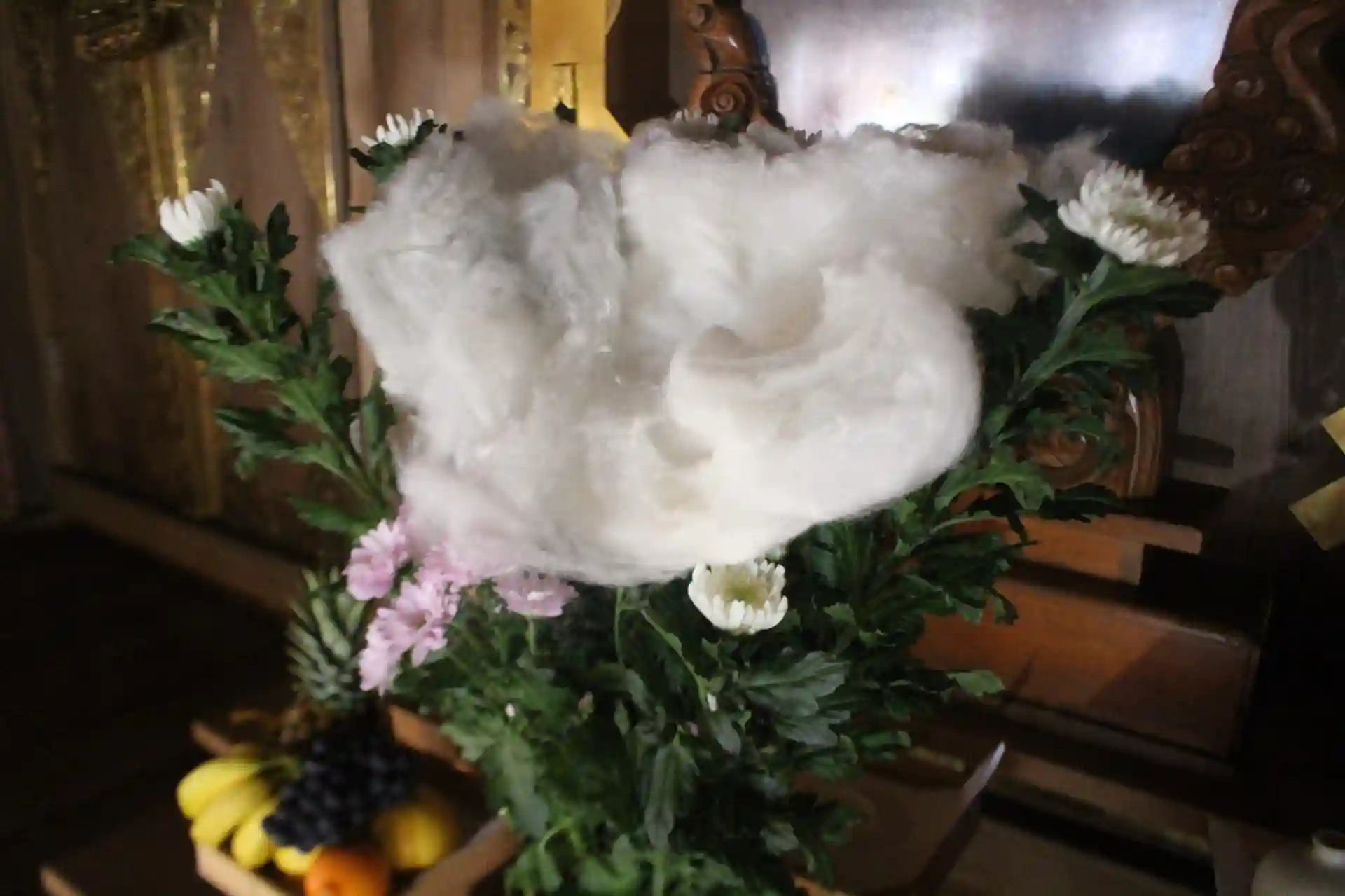 ご参列の皆様には前夜から菊の花に被せて香りを移した“着せ綿守”をお分かちいたしました。菊は薬草であることからその香りを移した絹の綿を身につけ病気平癒や健康を願うという風習に倣ったものです。