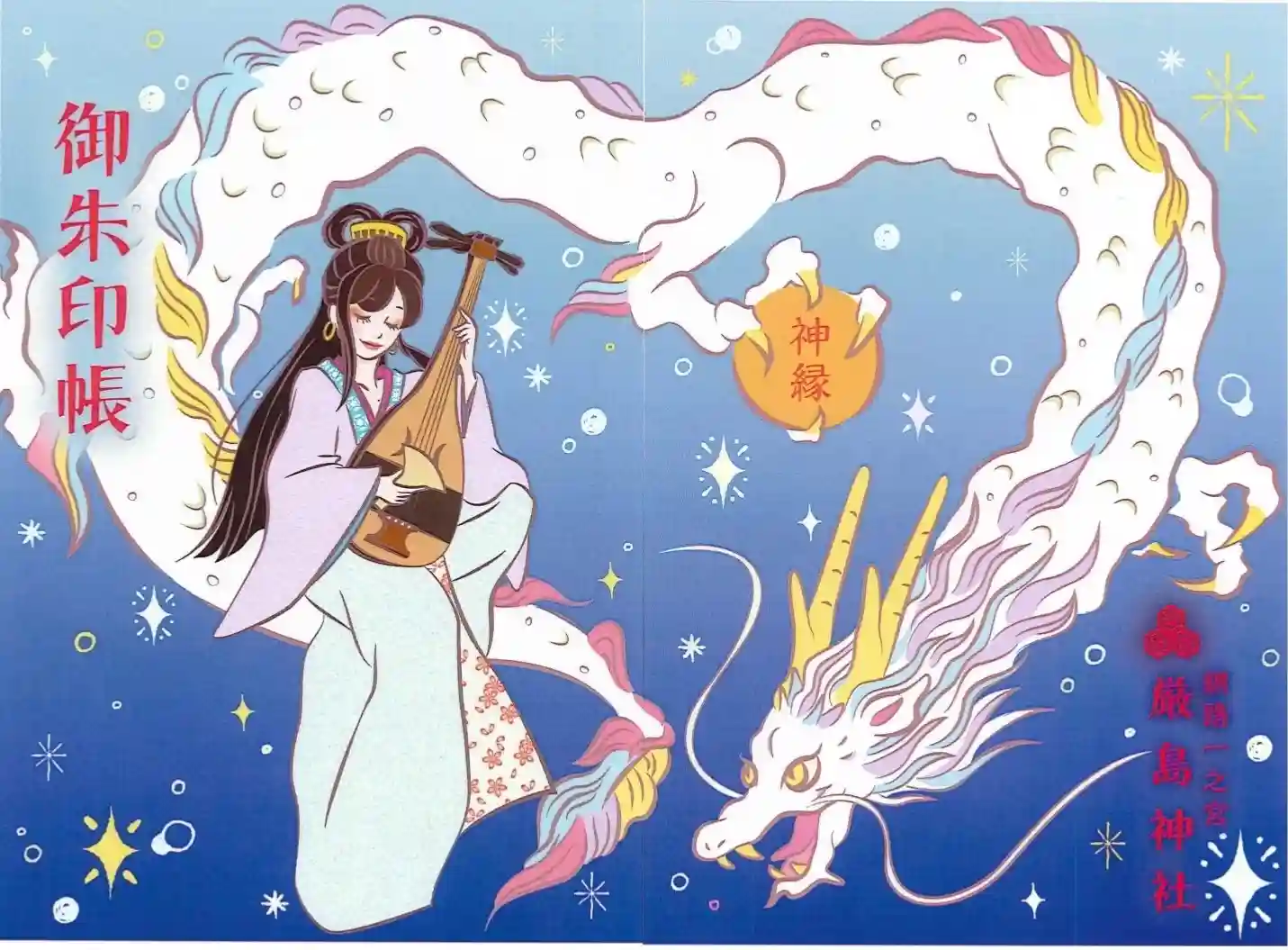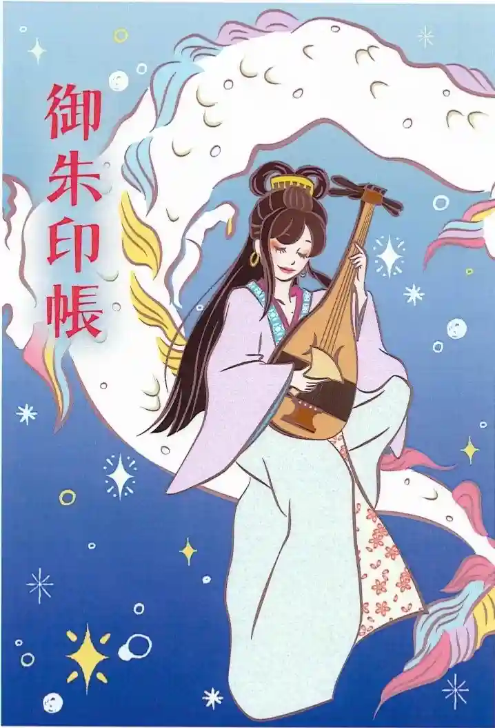 ピンク御朱印帳の色違いとしてネイビーを新たに奉製いたしました。当神社の主祭神•弁天さまが白龍に乗り優雅に琵琶を奏でる絵柄となっております。