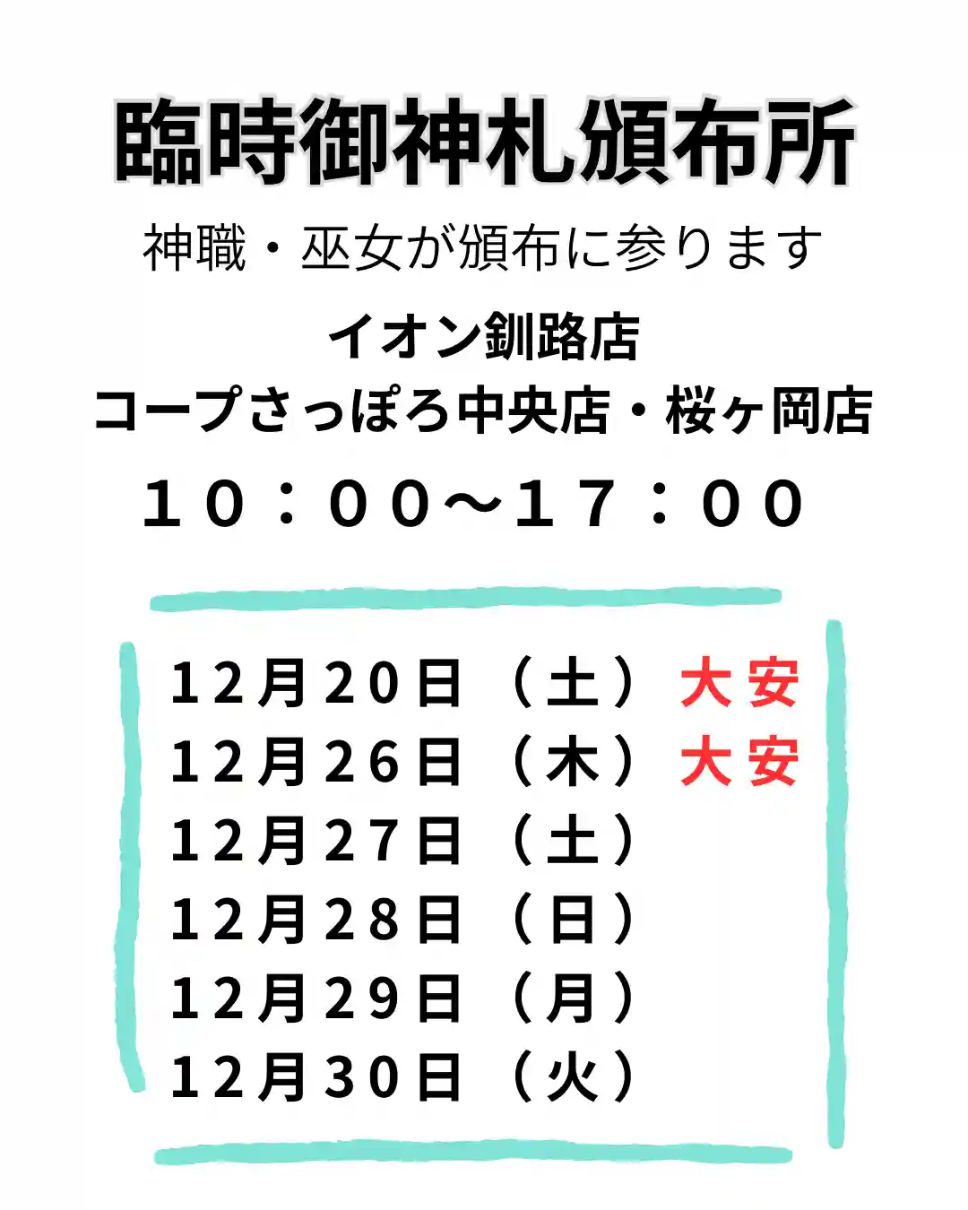 12/20・26〜30はイオン釧路店•コープさっぽろ中央店/桜ヶ岡店に出張頒布に参ります。お近くの店舗へどうぞお越しください。