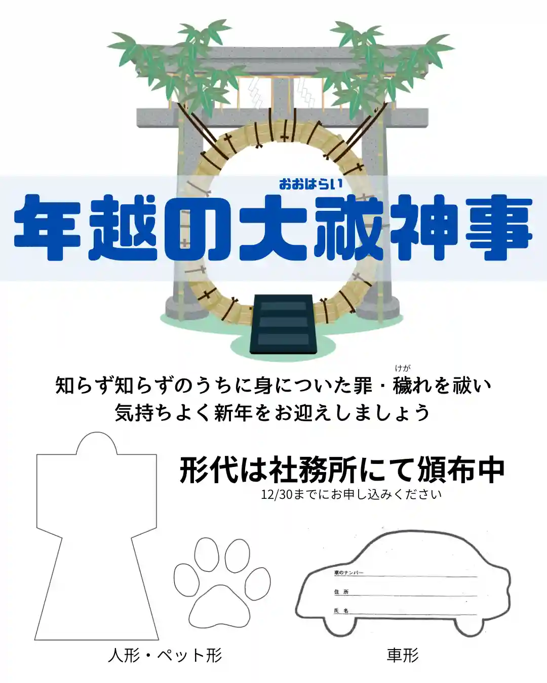 人形に今年一年積もり積もった穢れを移し祓い清めて気持ちよく新年をお迎えしましょう。