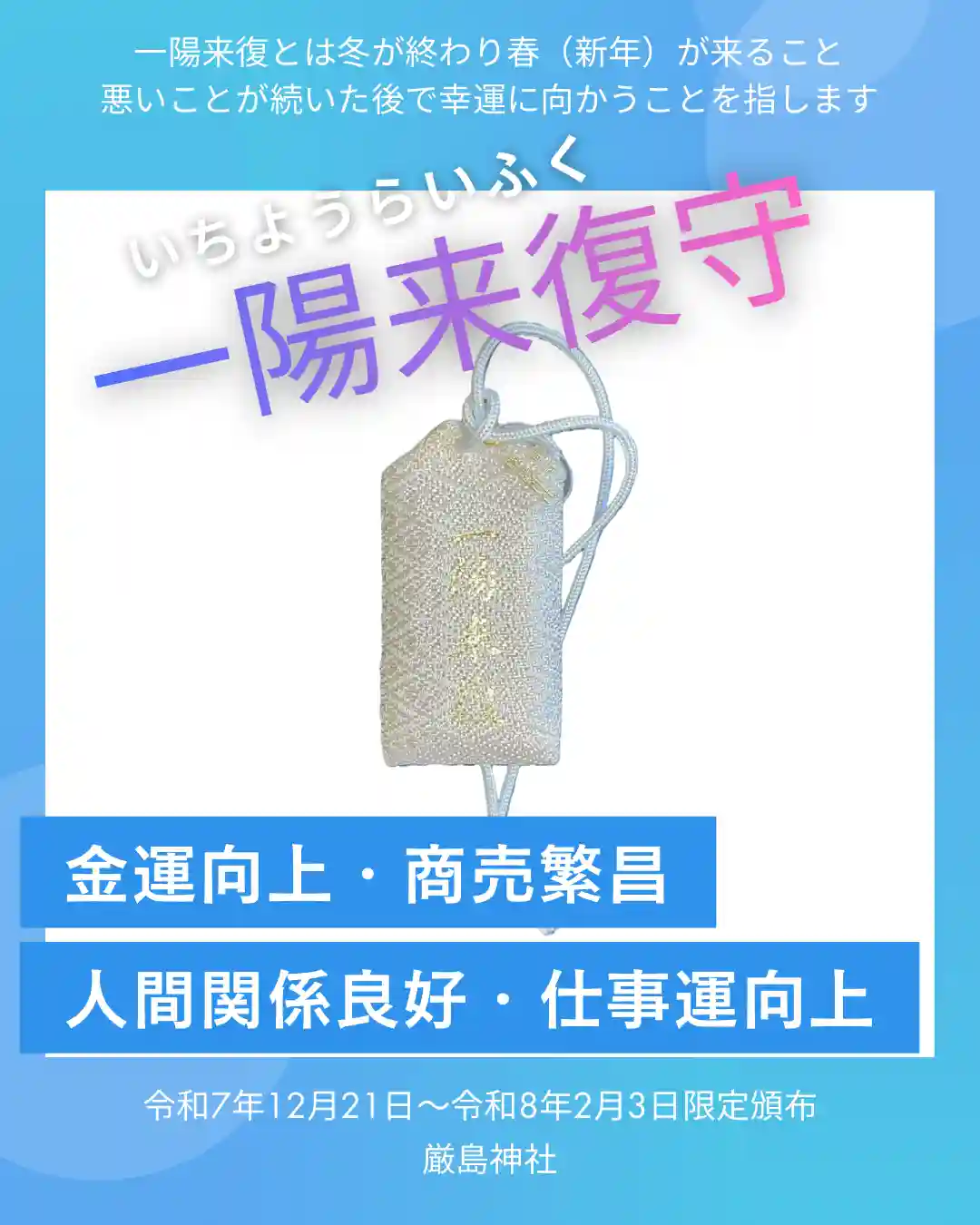 冬至の令和7年12月21日から節分の令和8年2月3日まで限定頒布となります。なお、なくなり次第早期に終了となる場合がございますので予めご了承ください。