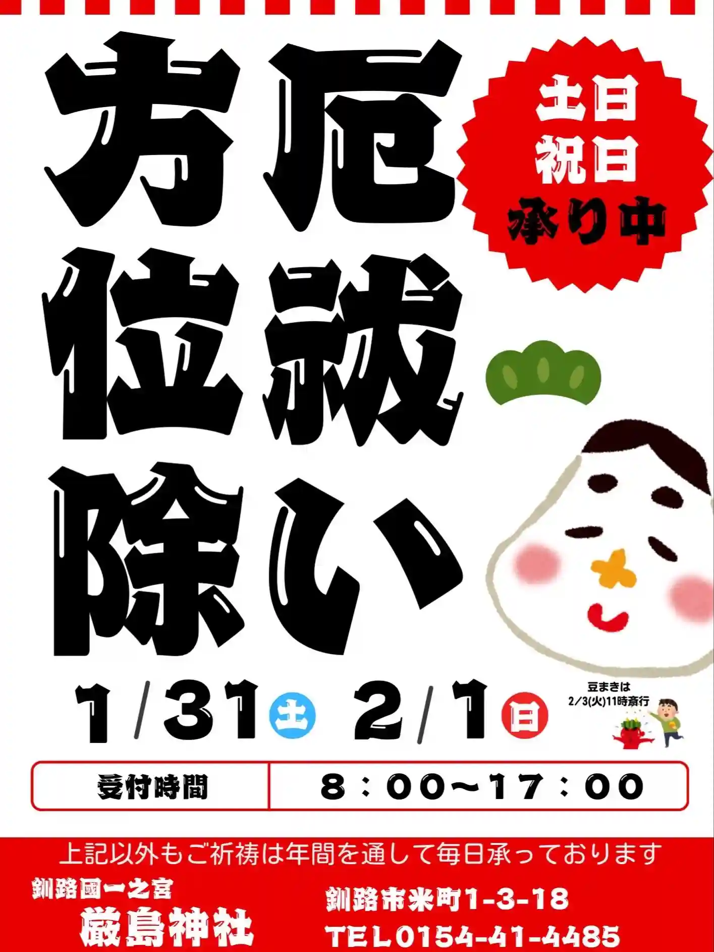 ⭐︎1/31.2/1は朝8時から夕方5時まで厄祓・方位除などのご祈願を執り行います⭐︎