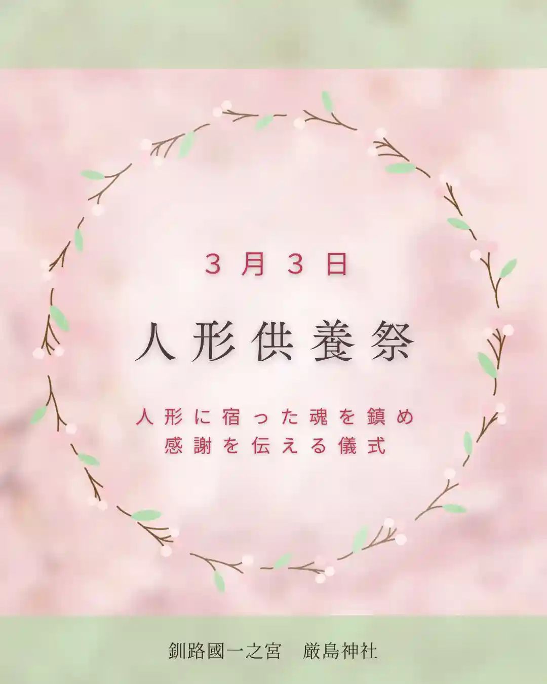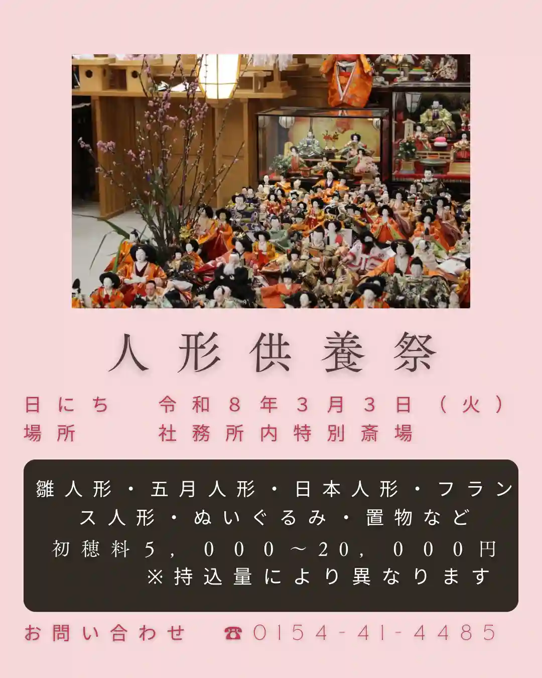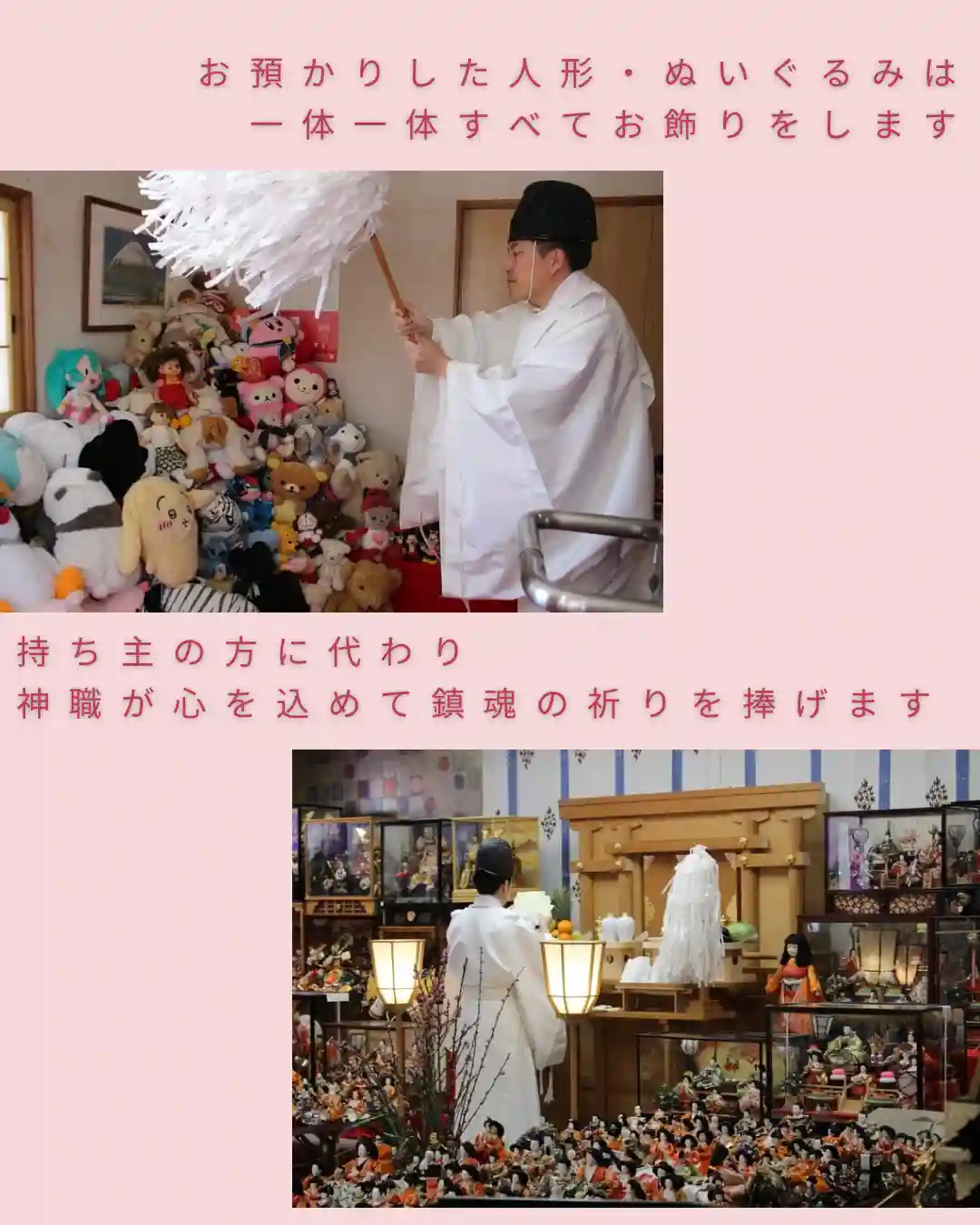 お人形をお預けの方は3月3日11:00〜の人形供養祭にもご参列いただけます。(参加自由、桃の花のお下がりあり)