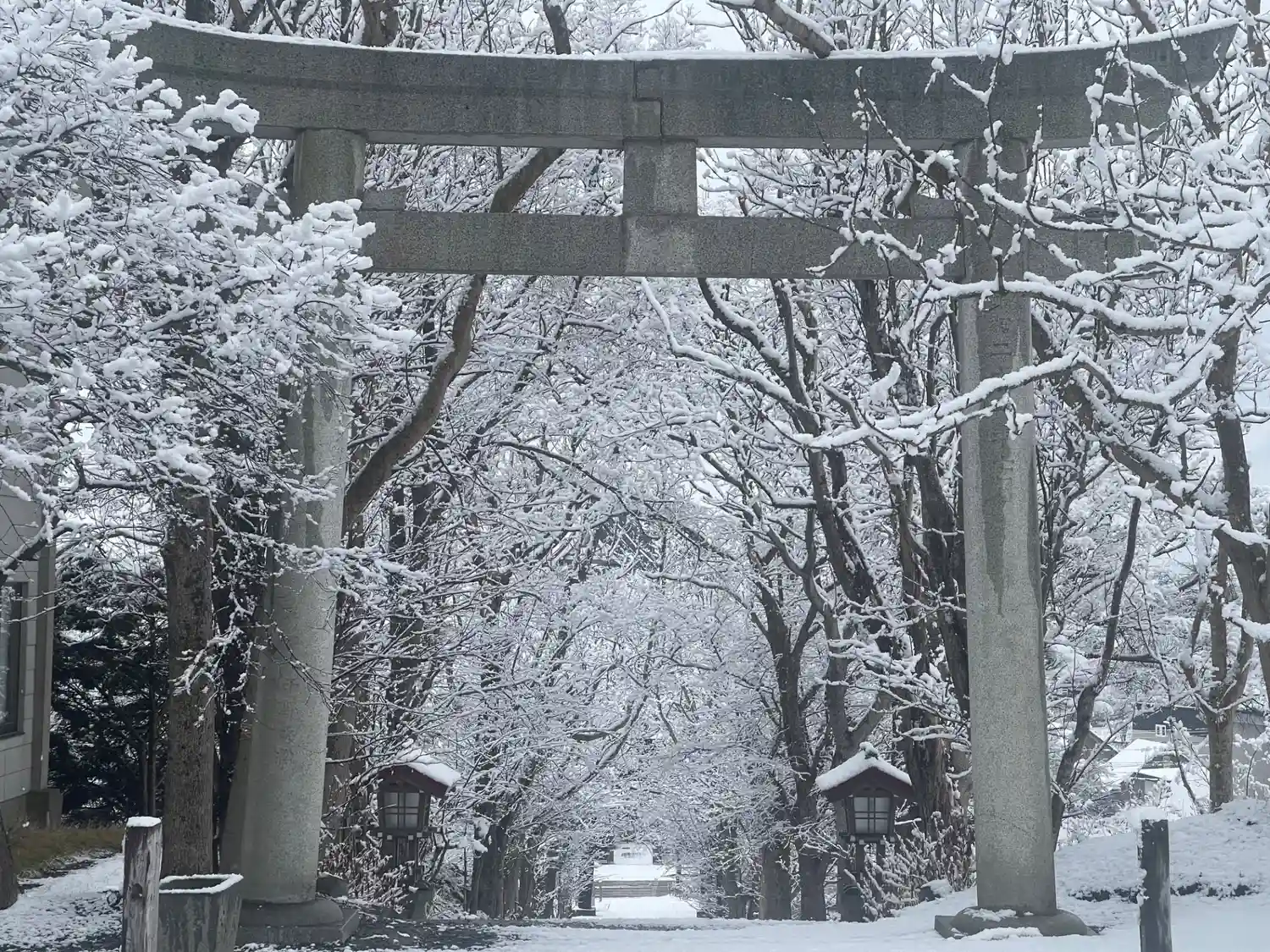 ちらちらと降り始めた今季の初雪はあっという間に境内を白銀の世界へと変えていきました。