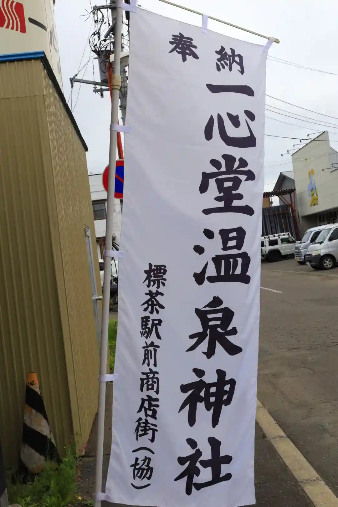 額には「一心堂神社」、旗には「一心堂温泉神社」と書いてあります。お社と狛犬一対のみの、小さな神社です。