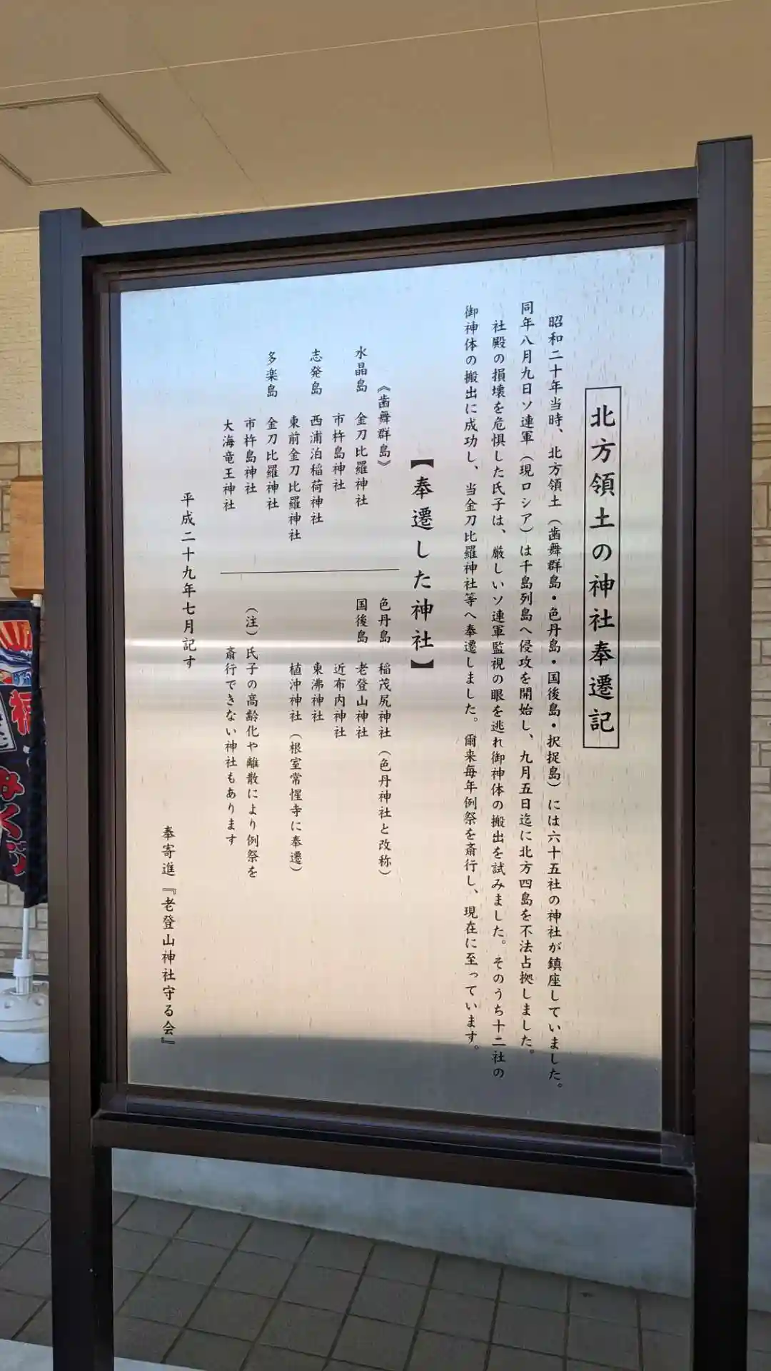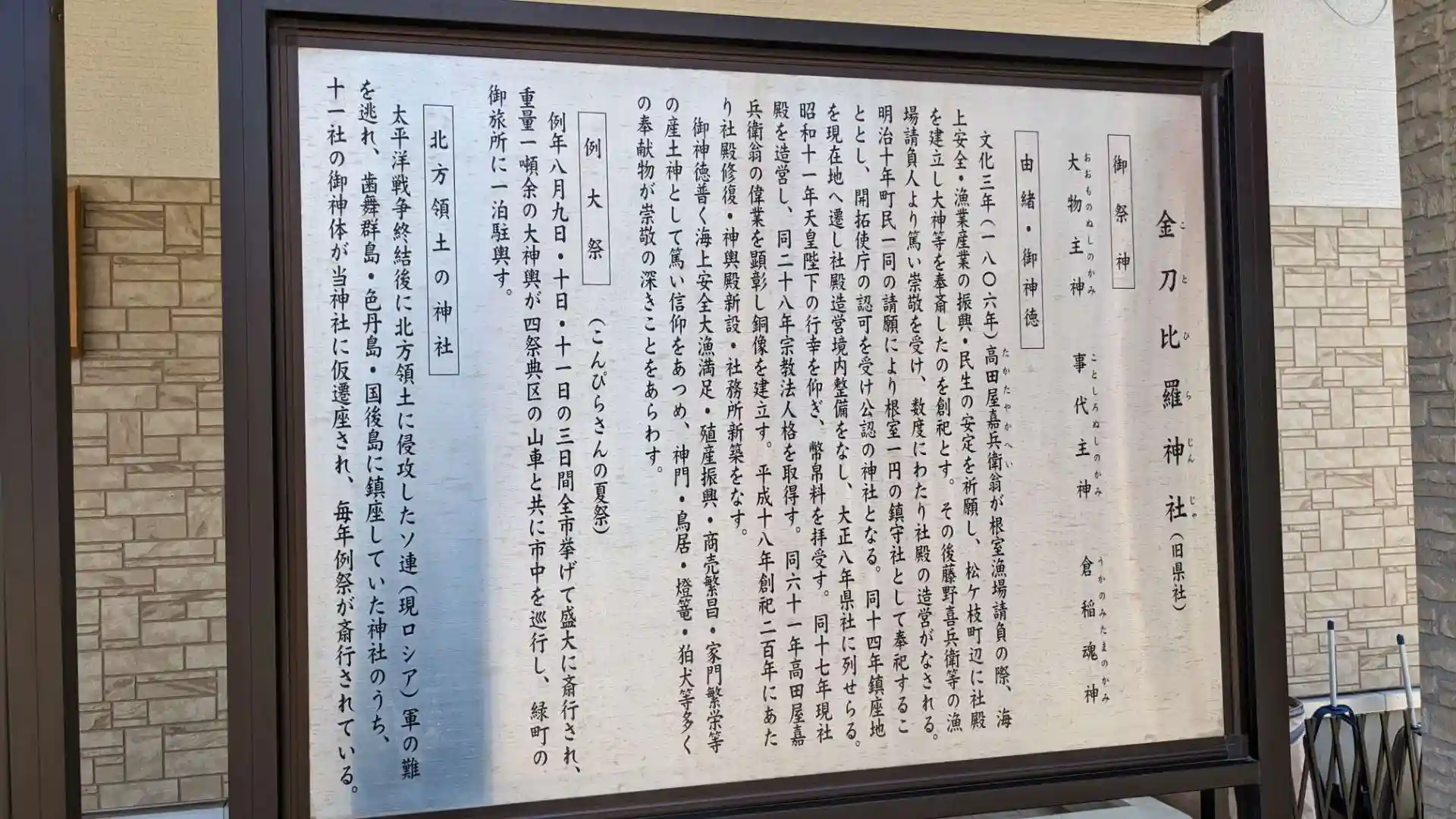 根室金刀比羅神社には戦後当時のソ連軍が北方四島を不法占拠した際に各地の氏子の方々が持ち出された北方四島の各神社の御神体が奉納されています。現在でも各神社の例祭を行っているそうです。