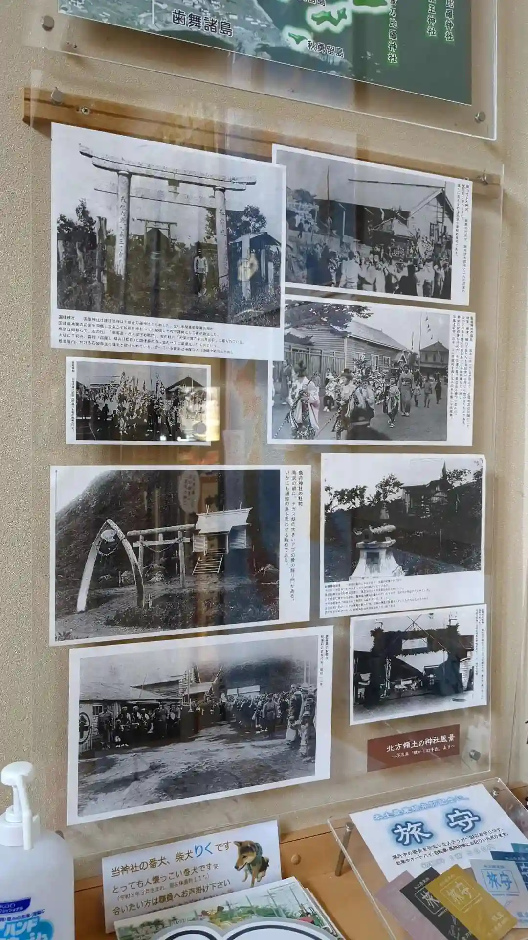 社務所内にある神輿殿にはお祭りで使用される御神輿が飾られていてお祭りの様子の写真や戦前の北方四島の各神社の写真が飾られています。