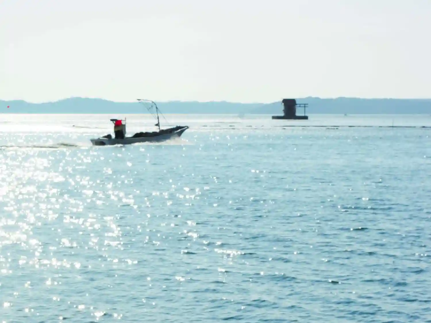 朝の6時、漁船が走り回る。牡蠣漁でしょうかね。