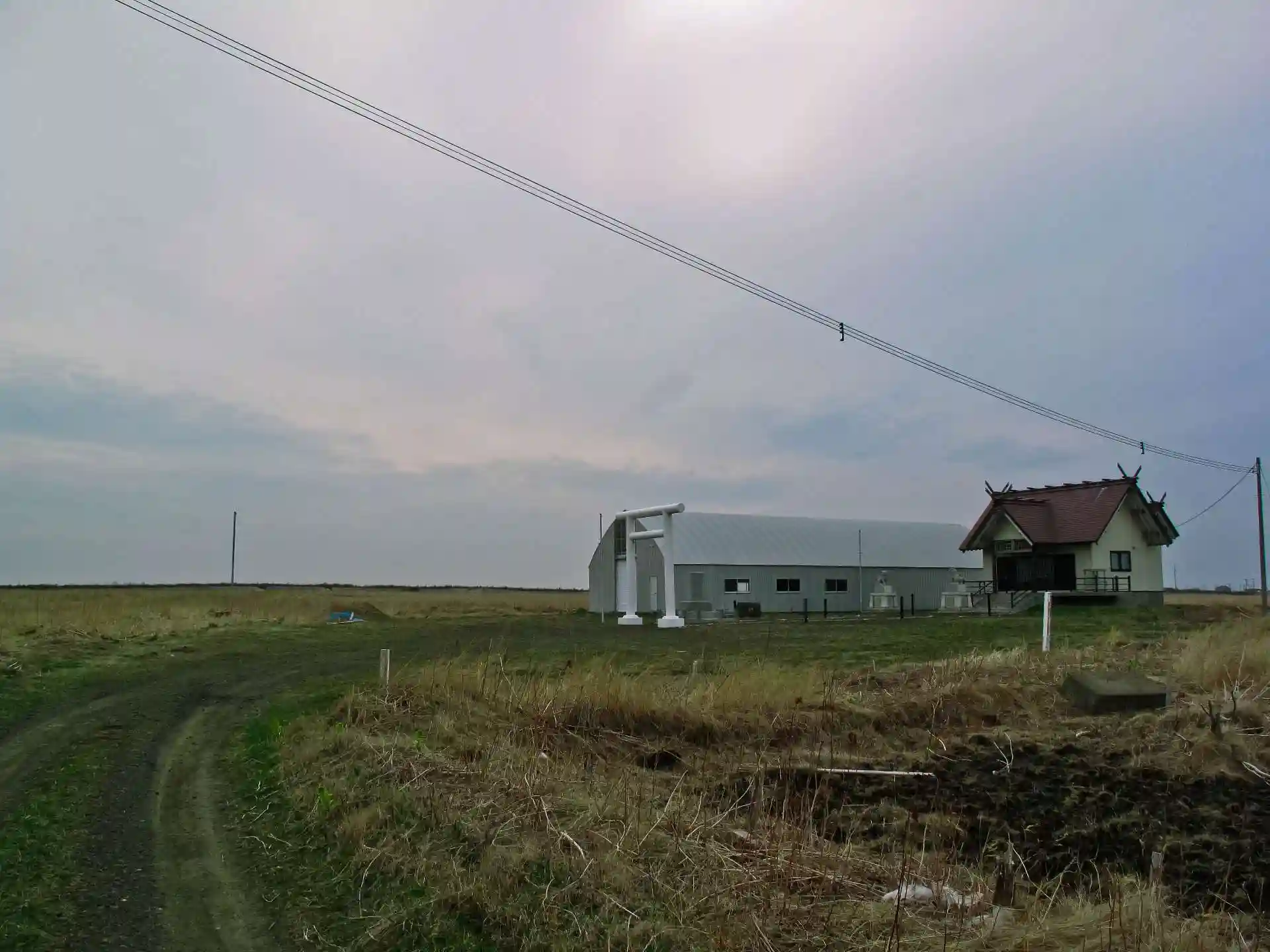 社殿と鳥居と狛犬だけの簡素な神社。左のハウスのような建物はなんだろう?(わからずじまい)