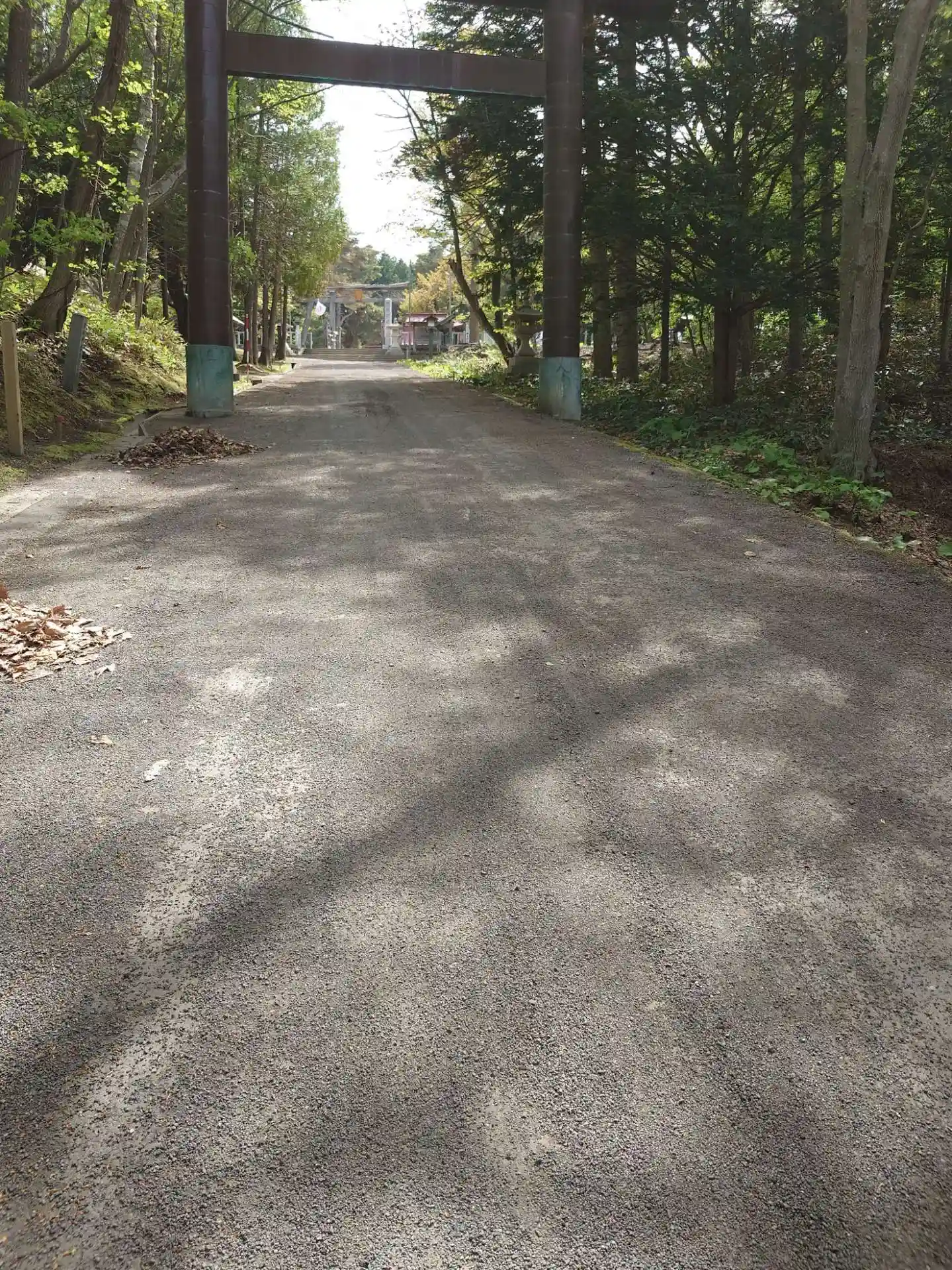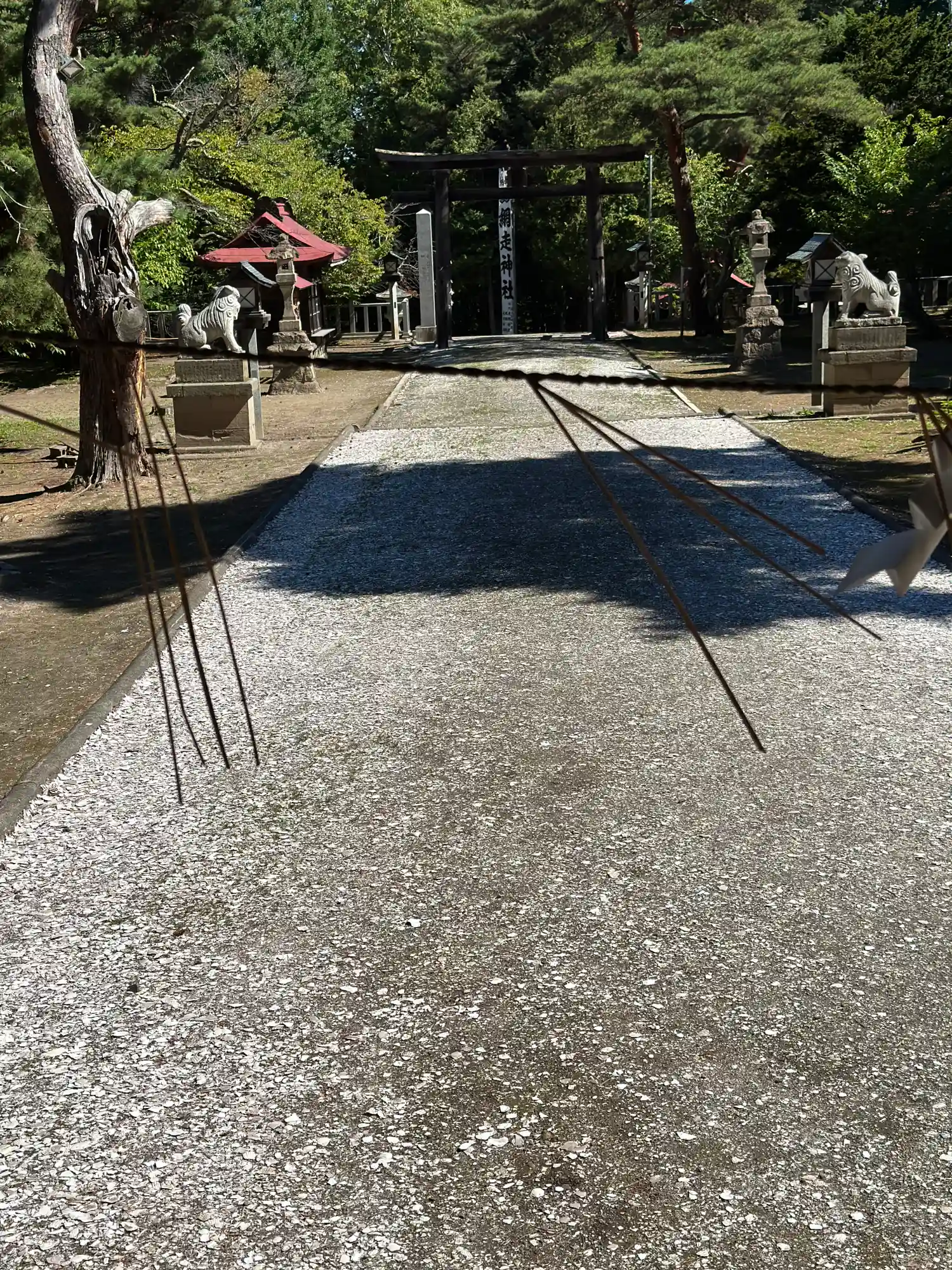 参道が白くなっています。貝殻(多分ホタテ)を砕いてるのかな?