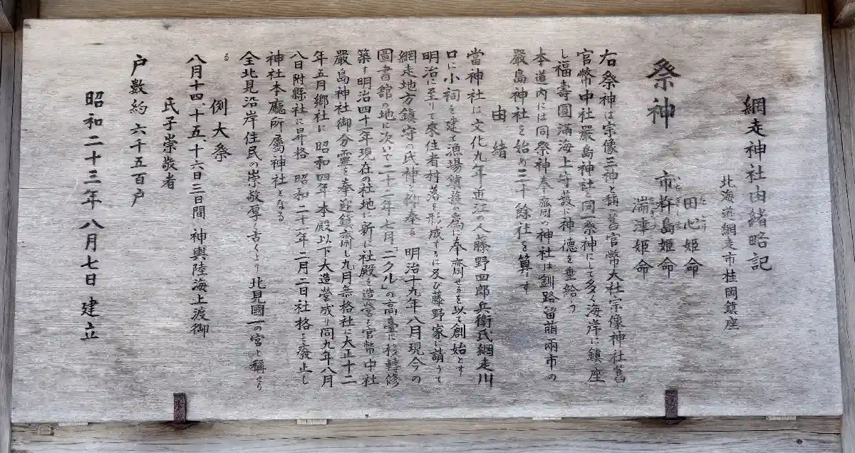1812年、近江の人・藤野四郎兵衛が網走川河口に小祠を建て、漁場鎮護の為…