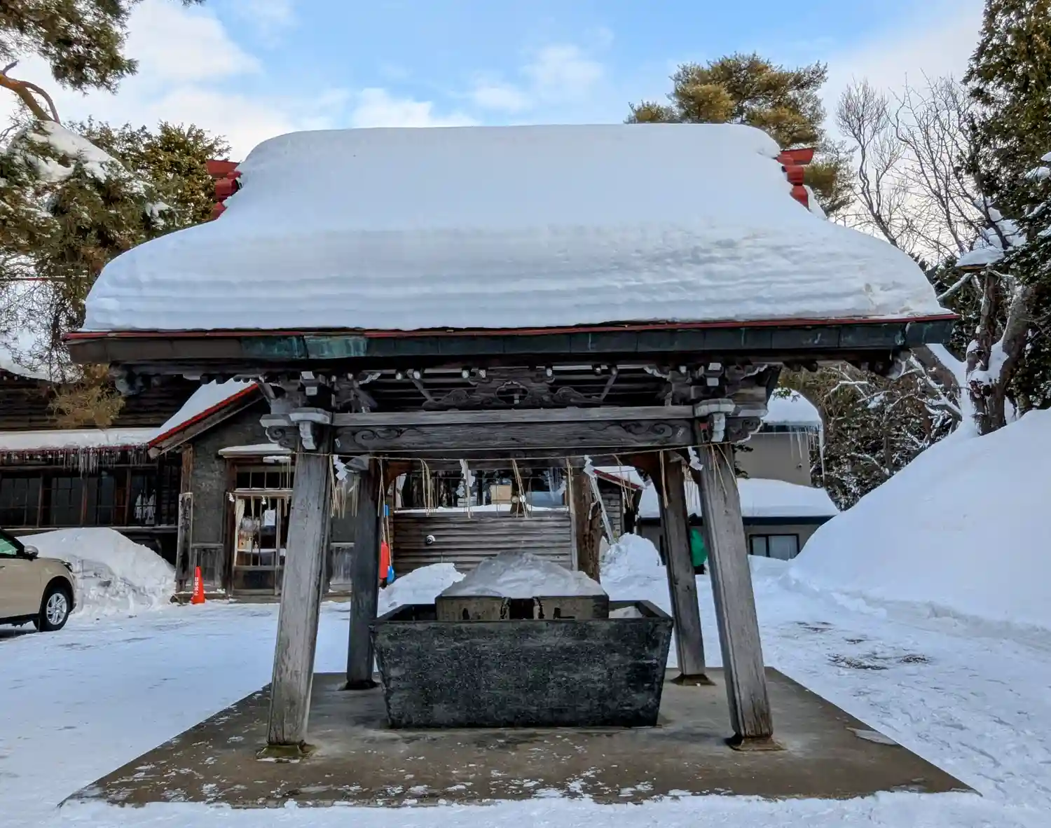 手水舎の屋根には雪がズシリ