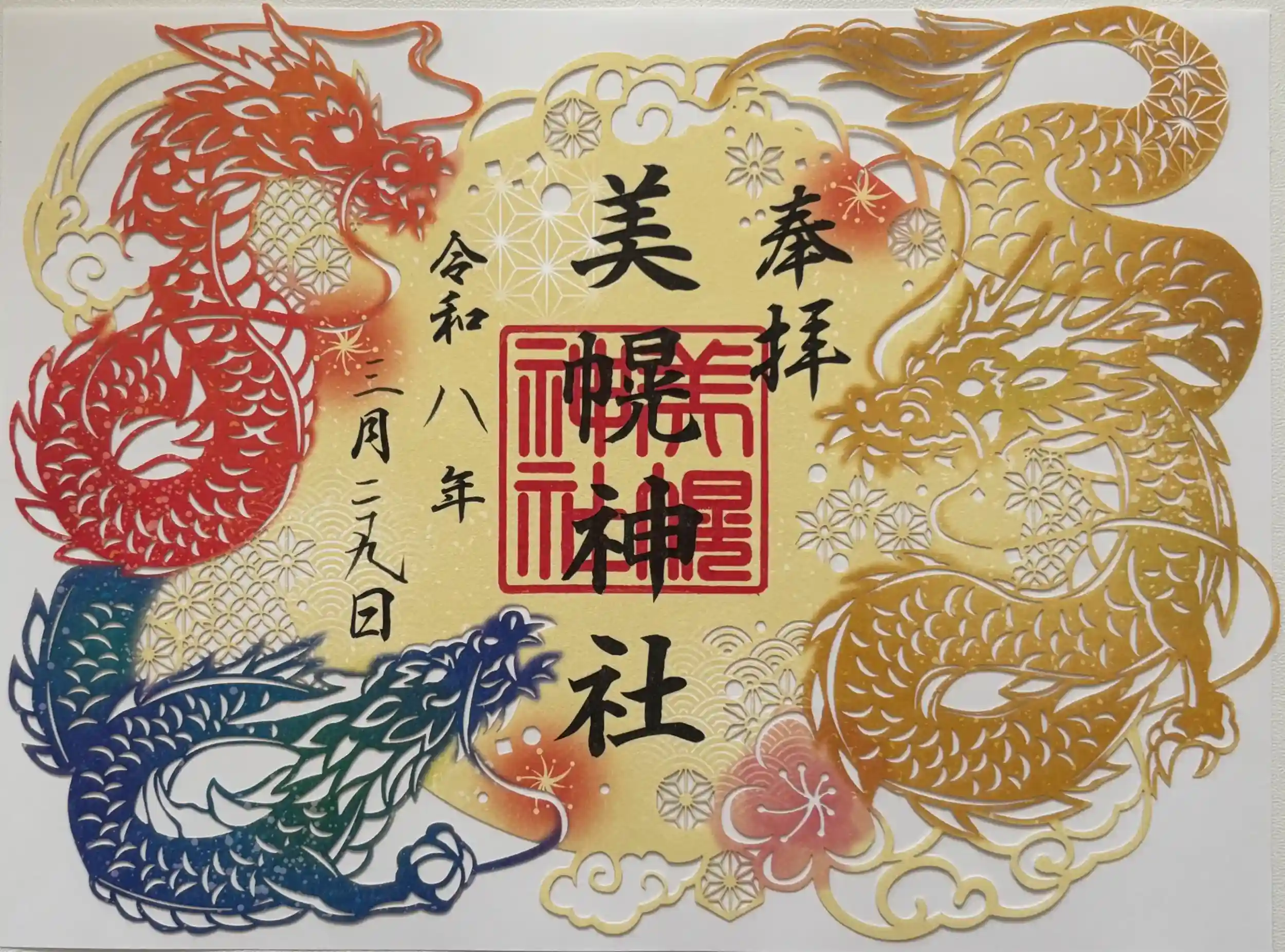 本日は一粒万倍と寅の日が重なる吉日との事で、朝一から神社巡り。美幌から気持ちの良い一日のスタートです。Instagramで紹介されておりました『天翔る三龍切り絵御朱印』をお受けしました。