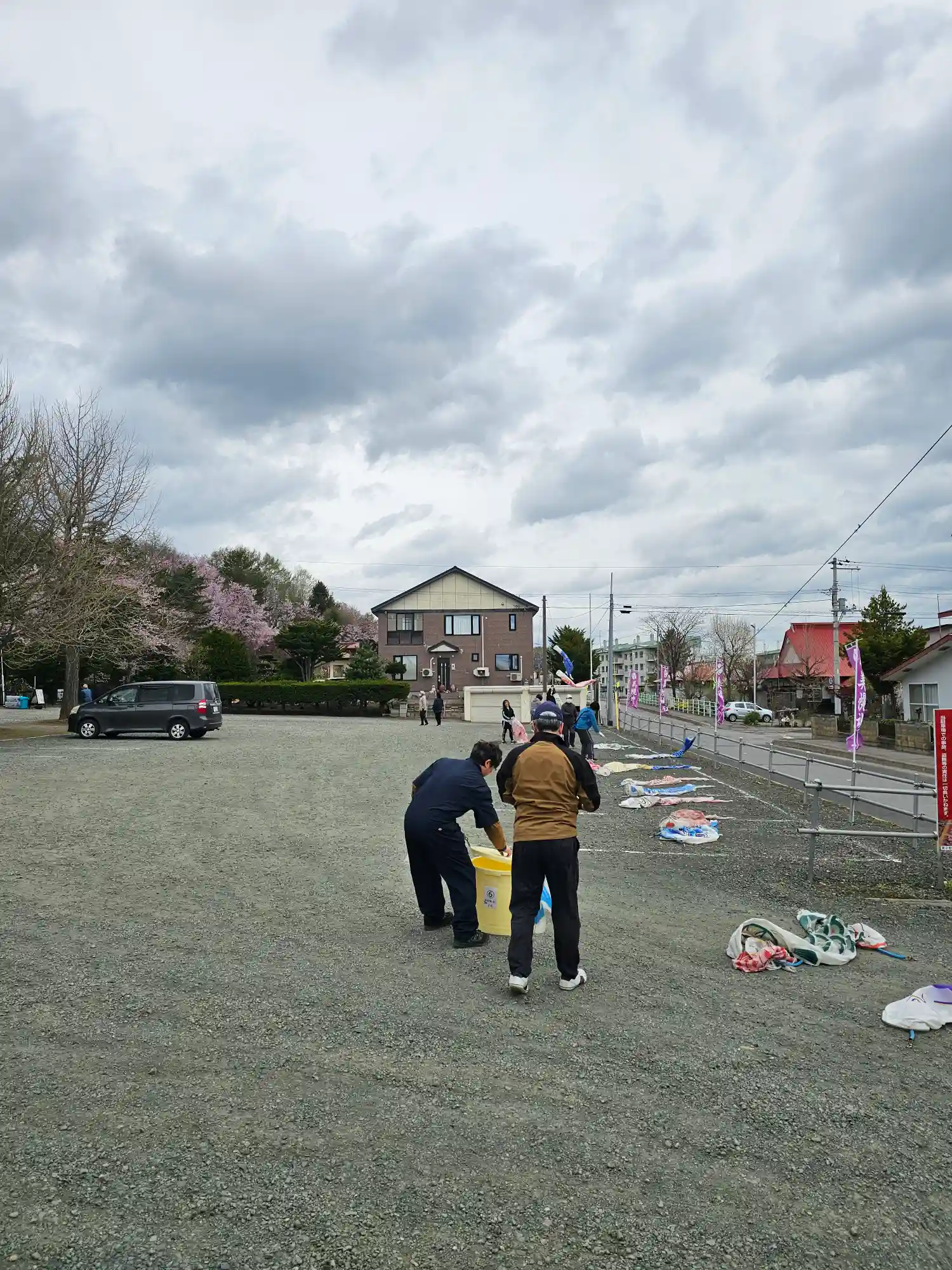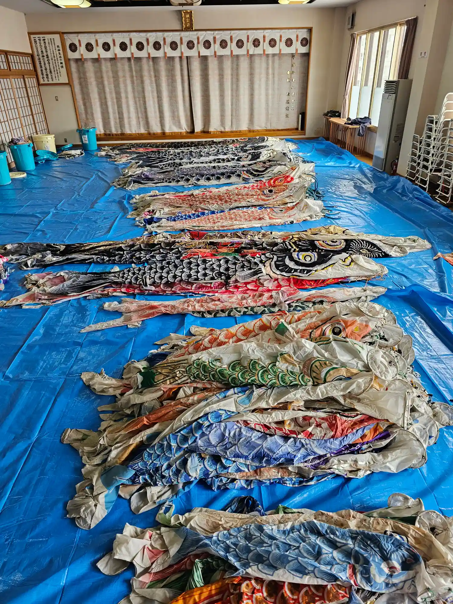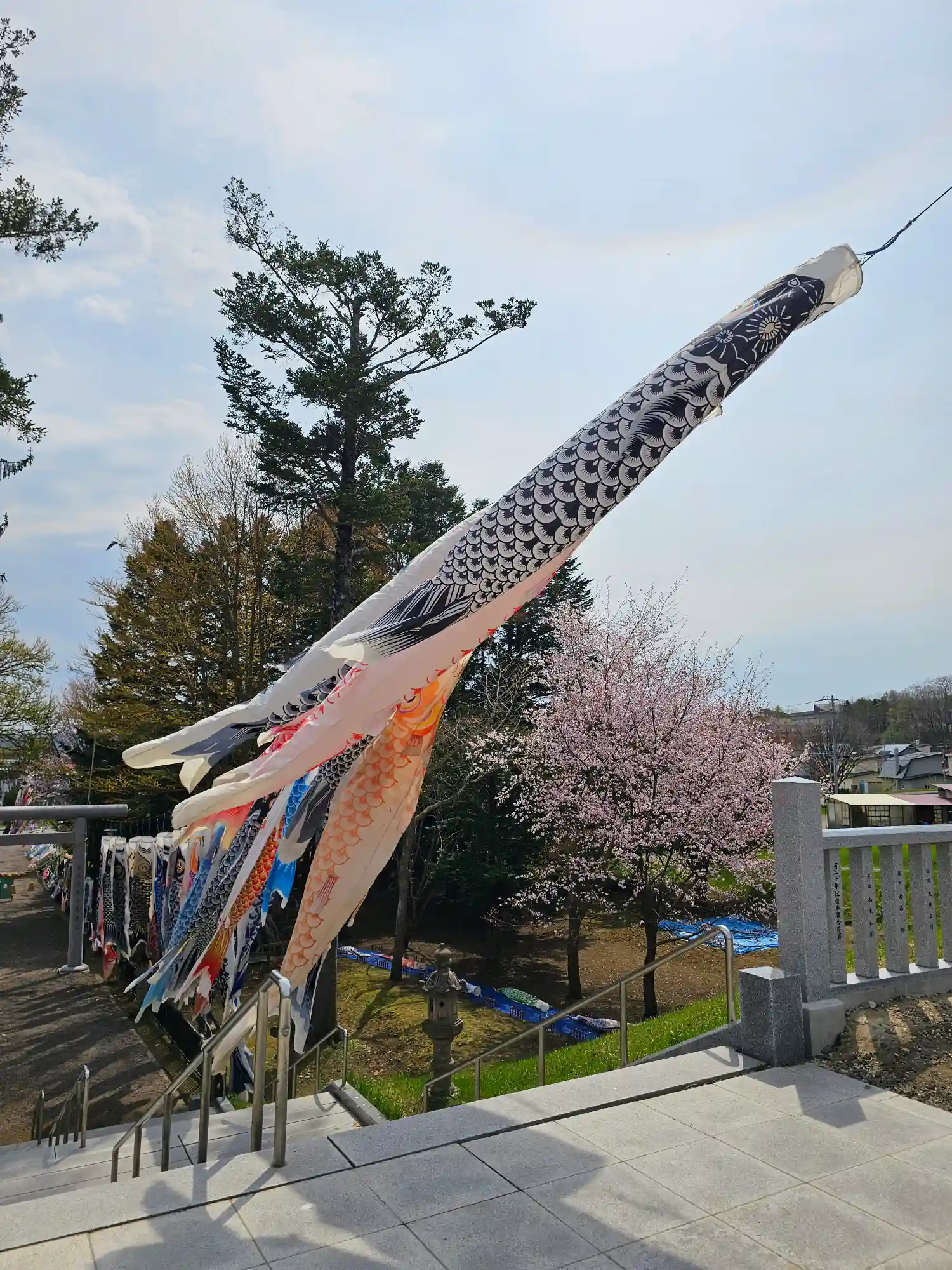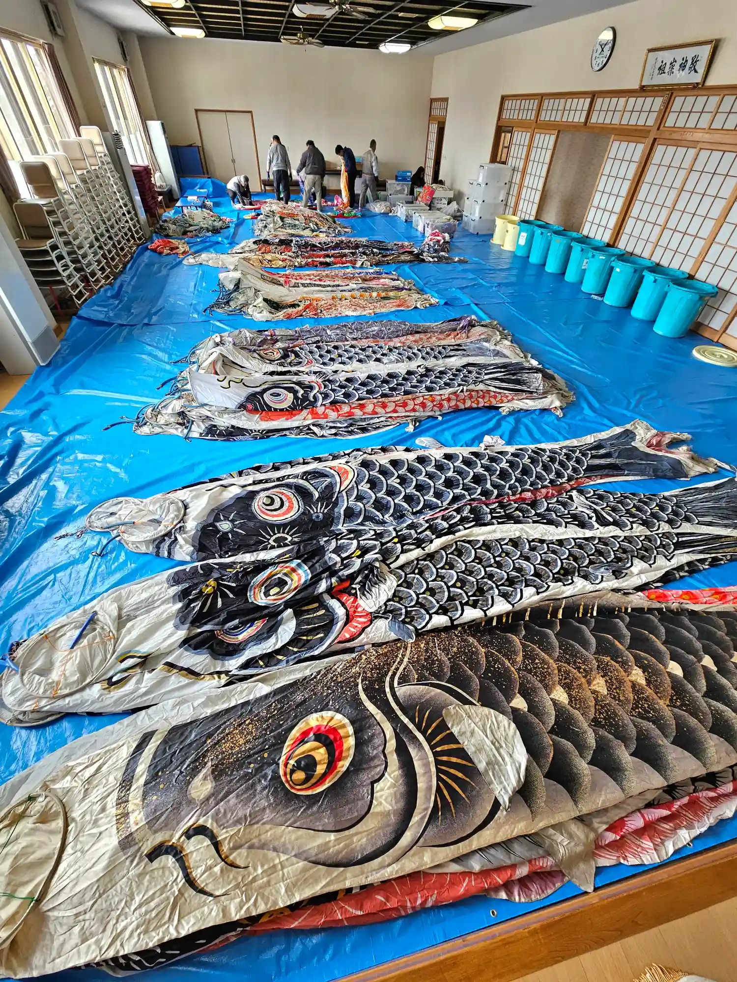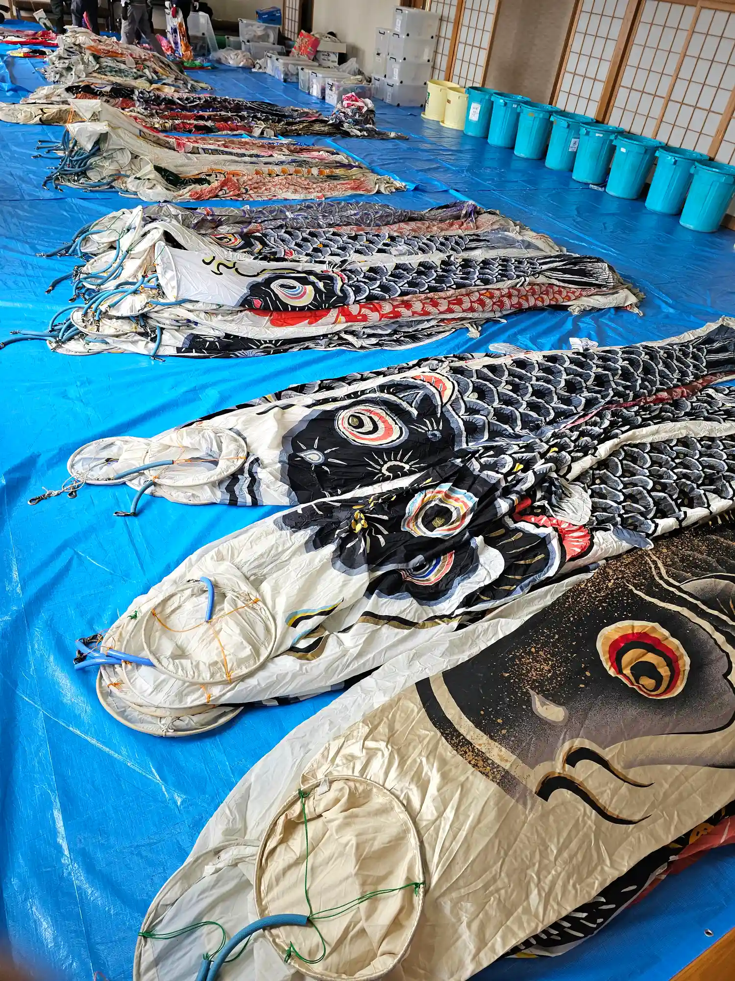 本日は朝より掲揚する鯉のぼり達の移動、ワイヤーの設…
