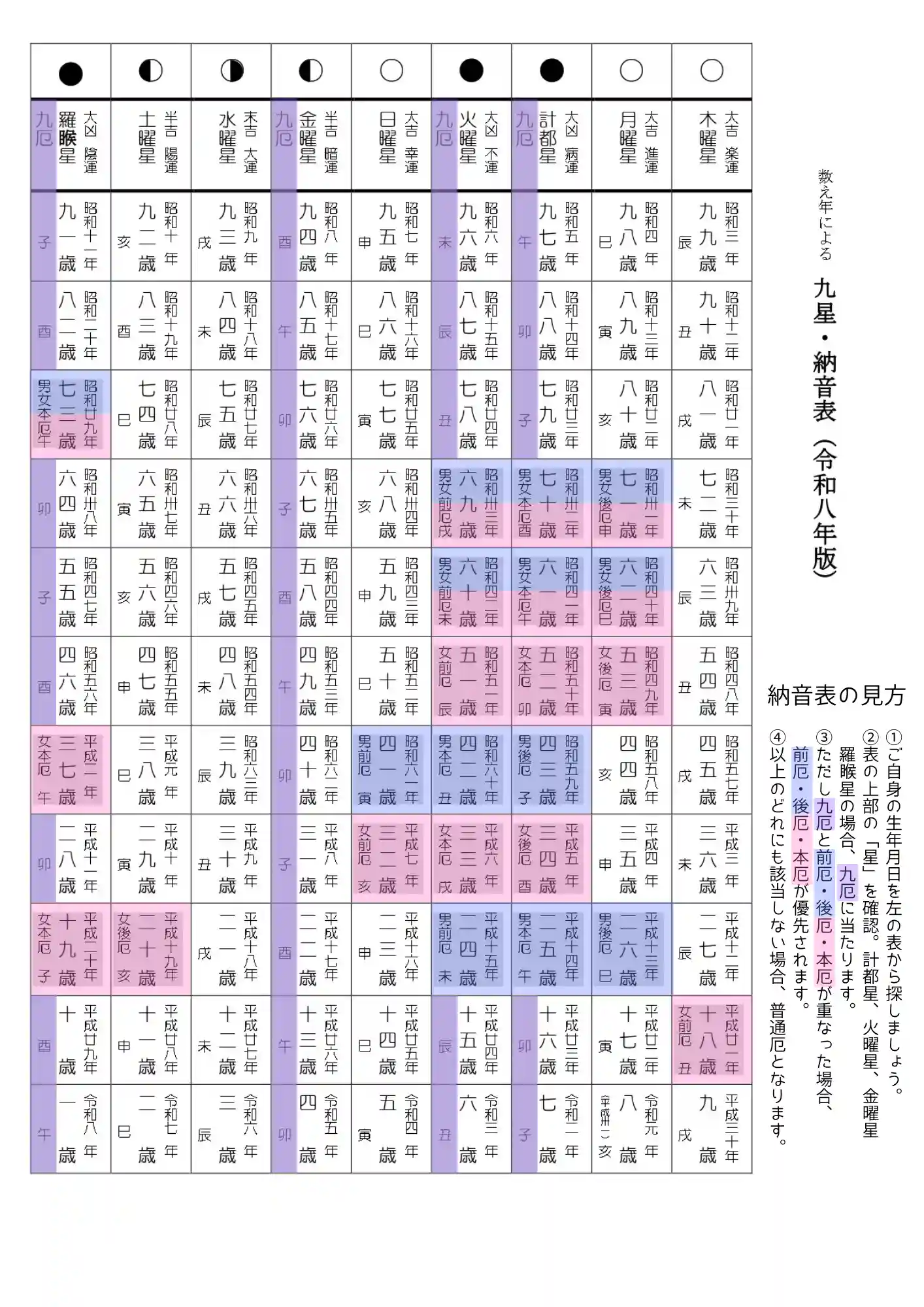 計都星・火曜星・金曜星・羅喉星の場合、九厄になります(紫色)