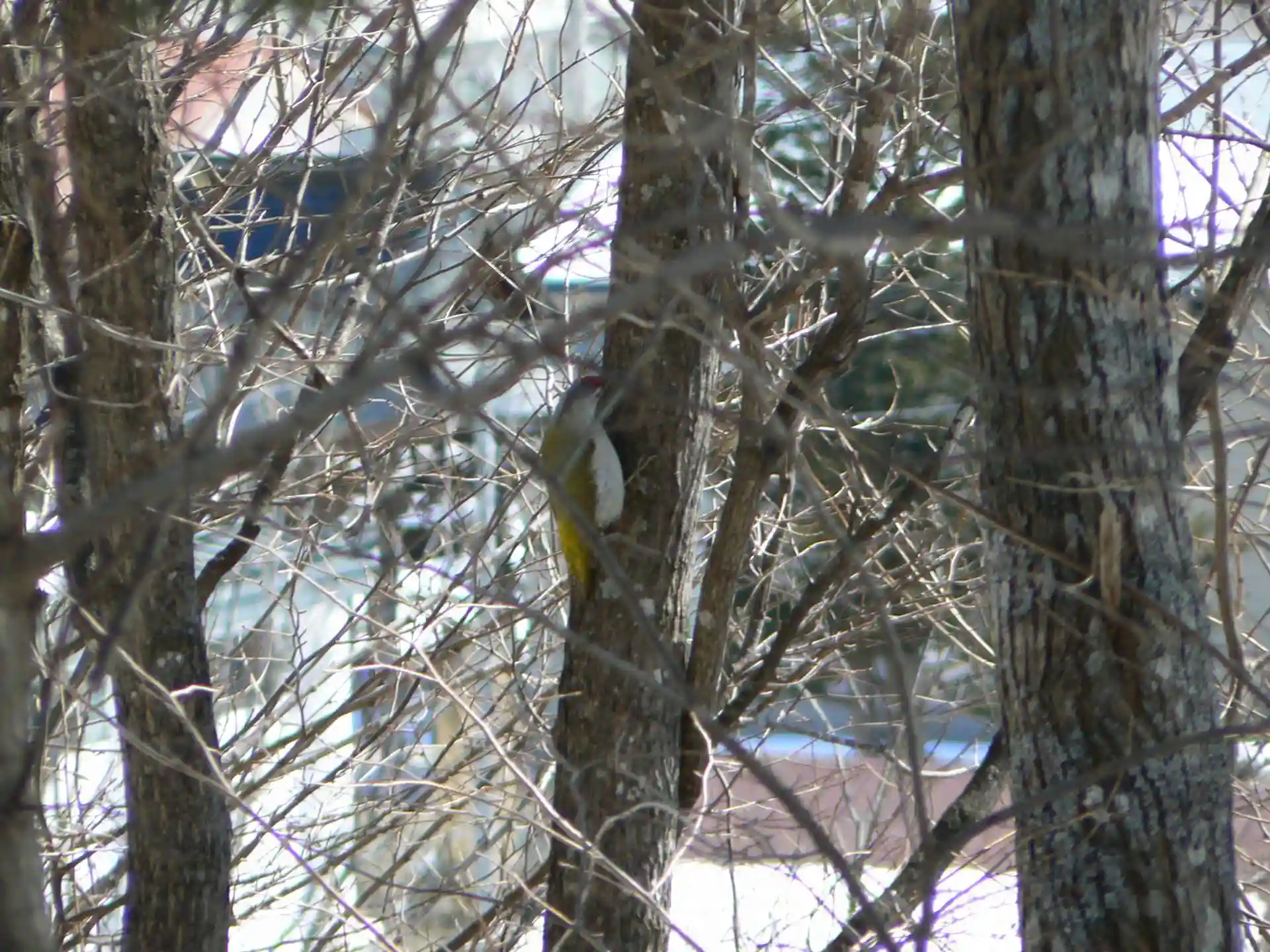 陽光に透かされた翼は明るい黄緑、頭頂部には赤いオスの特徴が見られます。