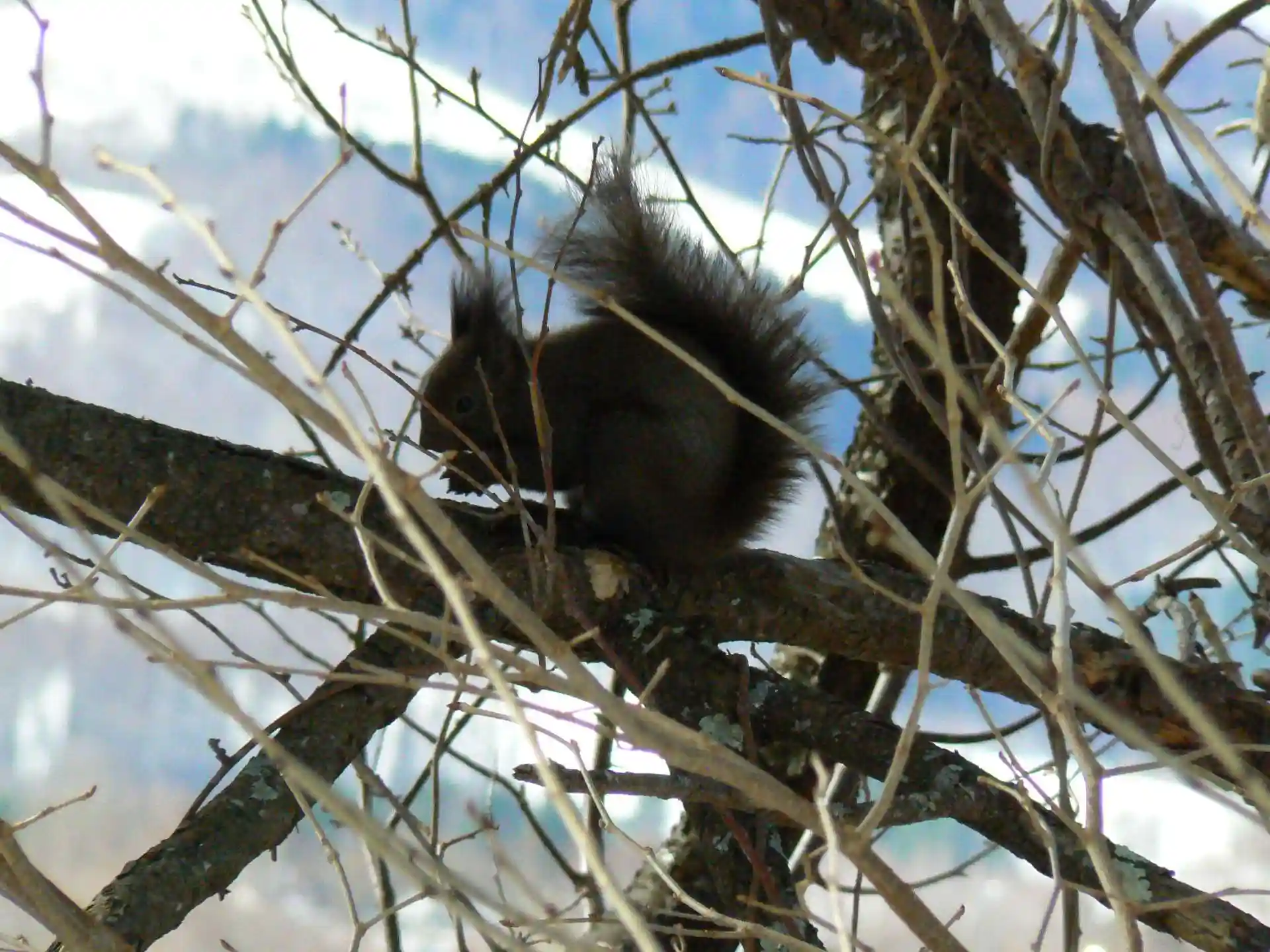桜の花芽が少しずつ膨らんできた境内で、エゾリスが同時に2体出現するという僥倖にめぐりあいました。