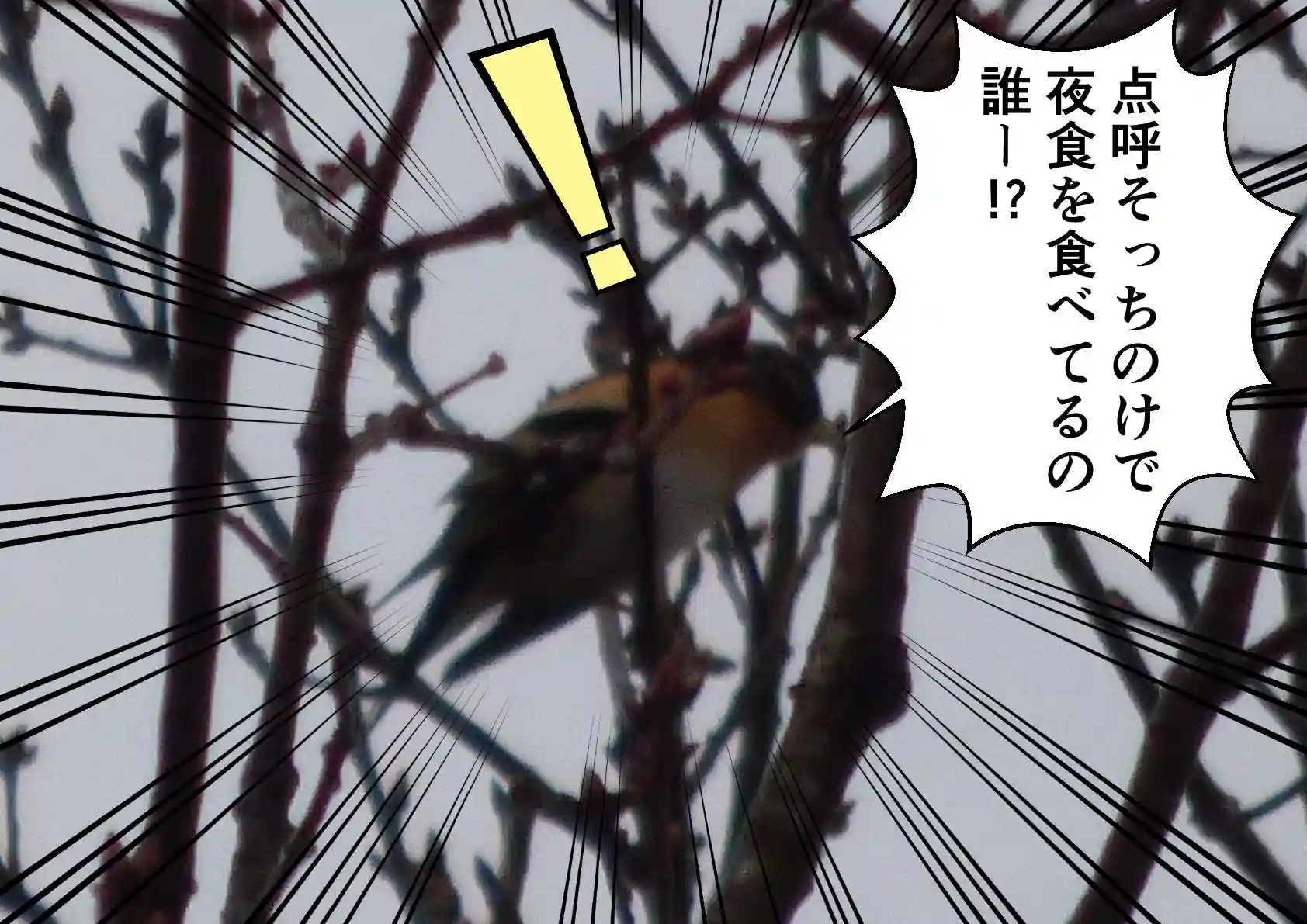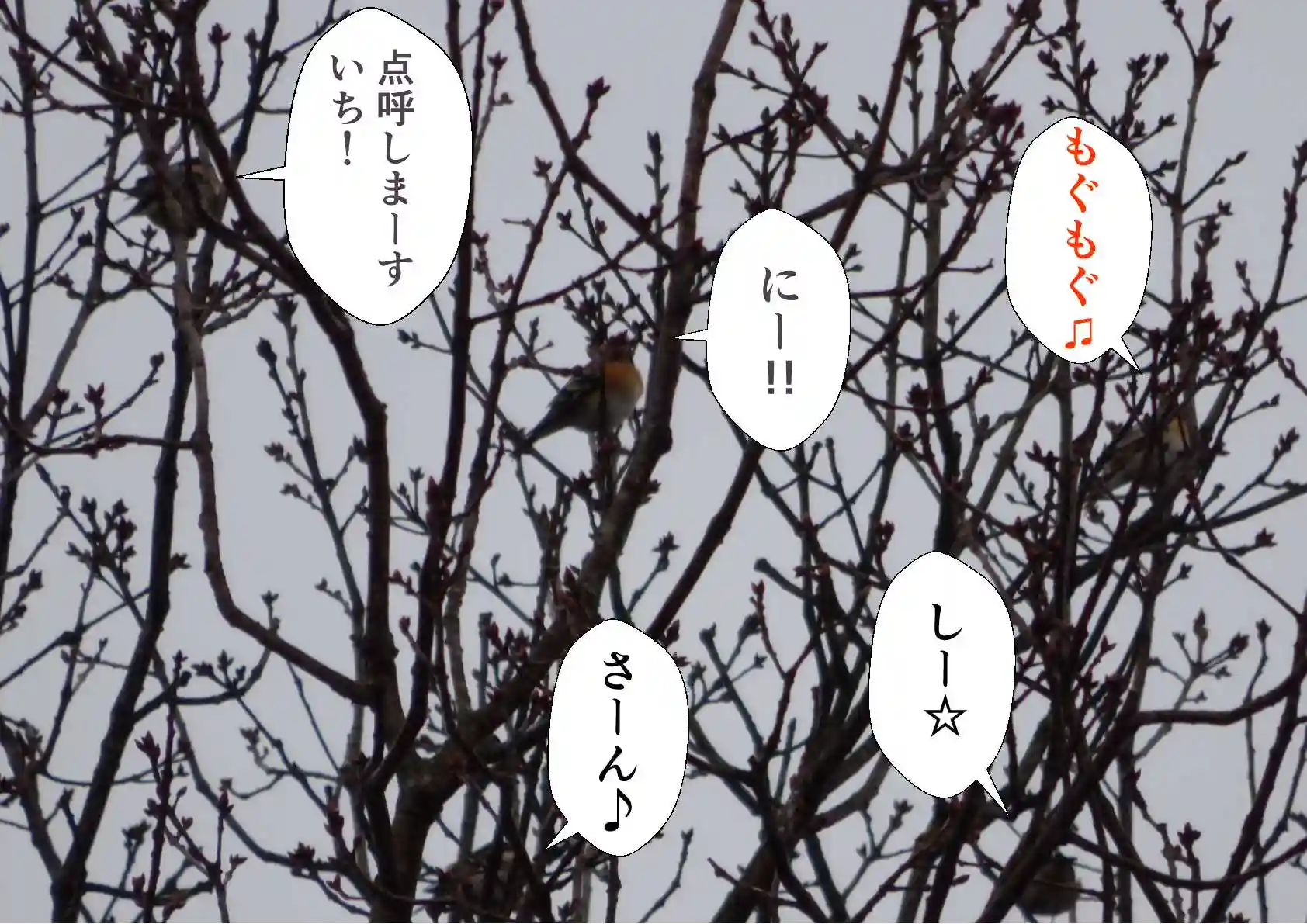 さて、先日は色彩豊かなアトリの群れが飛来し、桜の樹上は大変賑やかな夕暮れ時となりました。