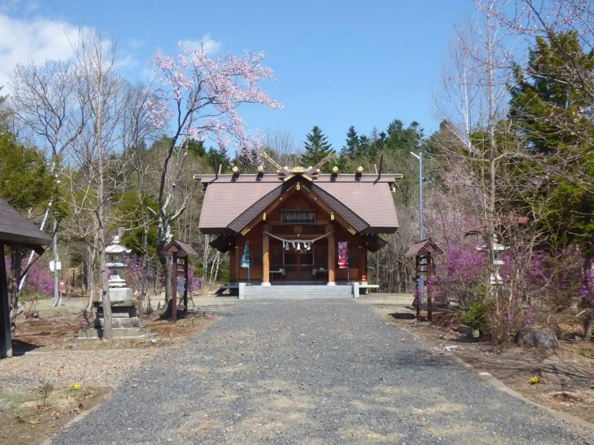 ツツジの開花に刺激されたように、境内の桜がほころび始めた留辺蘂神社です。