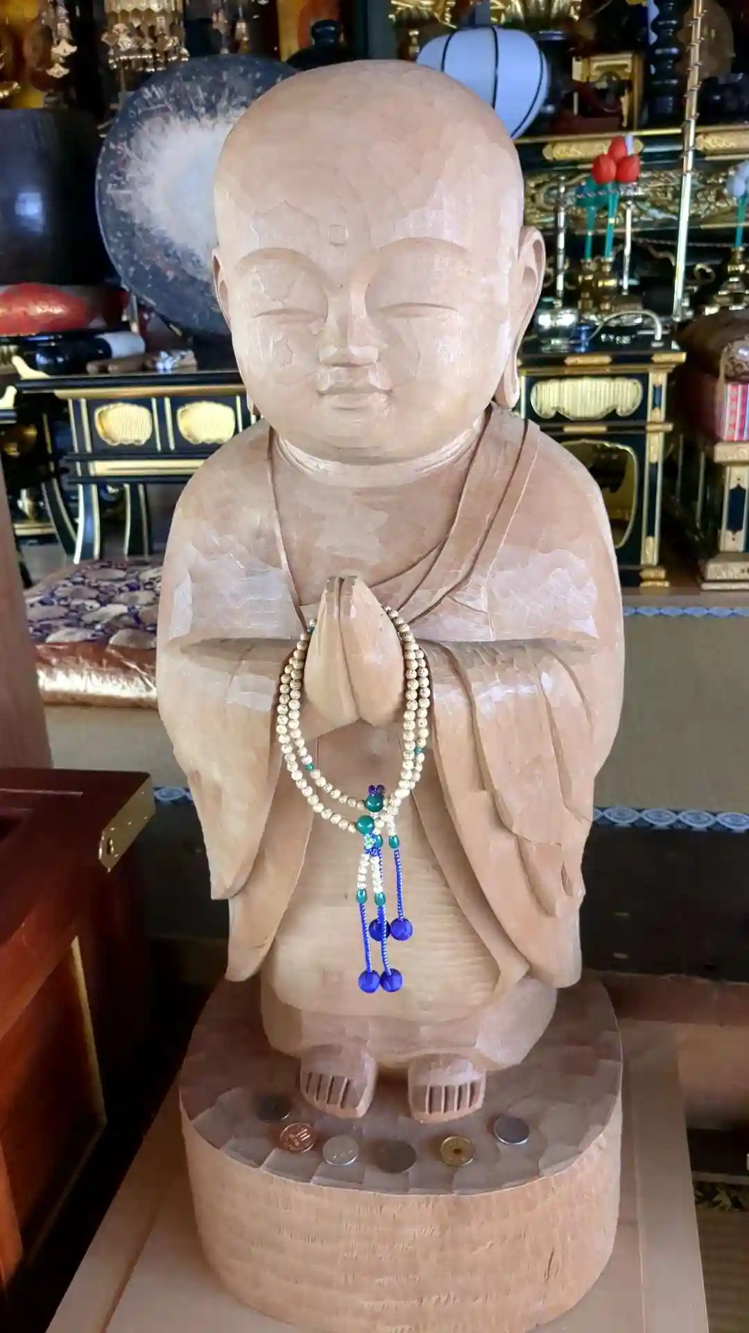 本堂内へは本堂右横の建物から入れます。御本尊前にはなんとも言えない魅力を放つ木彫りのお地蔵様が。