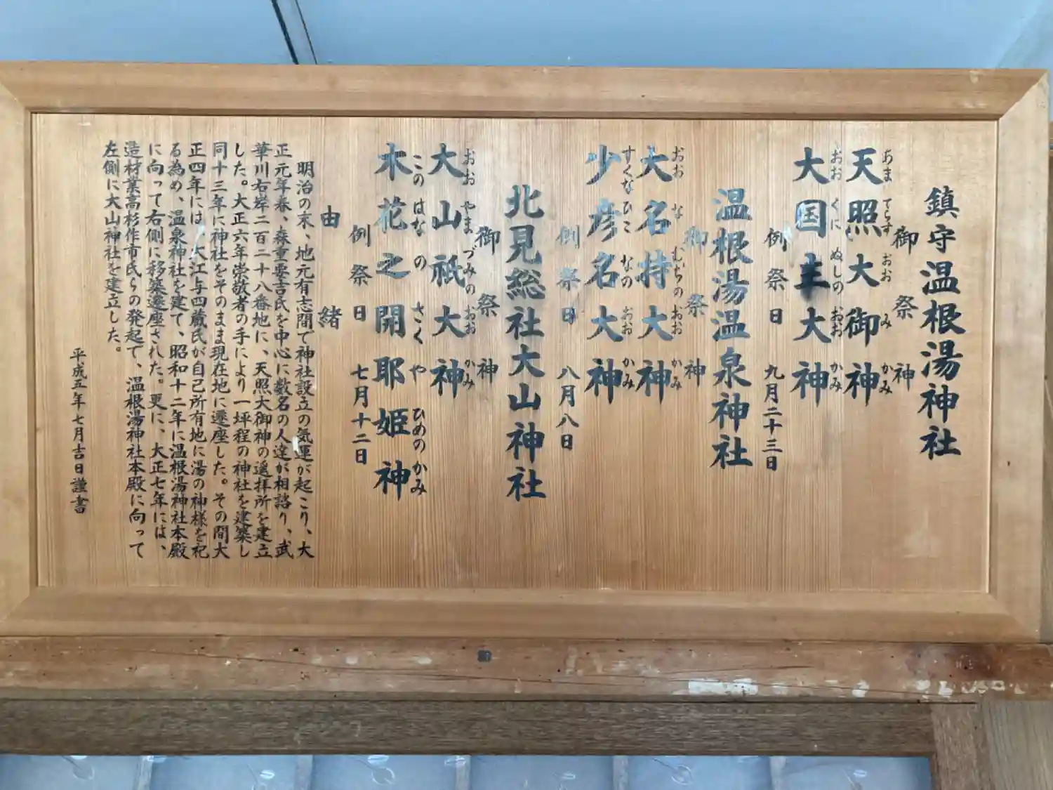| ご祭神 | 【鎮守温根湯神社】天照大御神、大国主大神 【温根湯温泉神社】大名持大神、少彦名大神 【北見総社大山神社】大山祇大神、木花之開耶姫神 | |