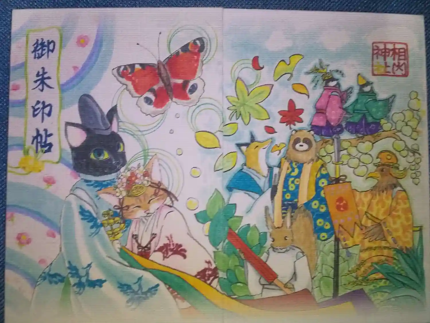 《御朱印帳》4面に連なる御朱印がお書き入れ済。右側には神社に縁のある鳥達。左側の猫ちゃんは社務所の黒&トラちゃんと思われます。織り生地なのか風合いも素敵。