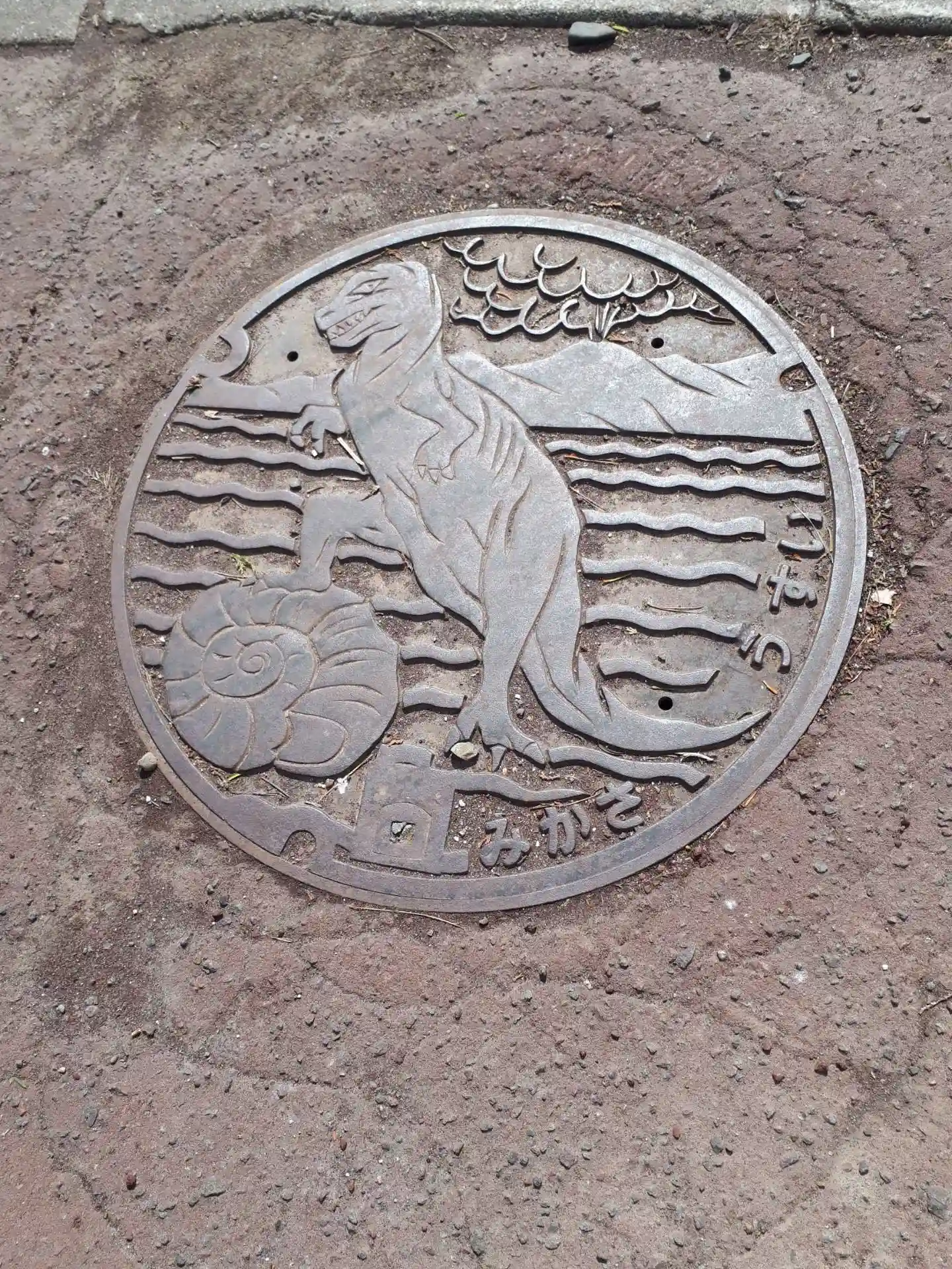 鳥居の前のマンホール🦕と🐌(アンモナイト)